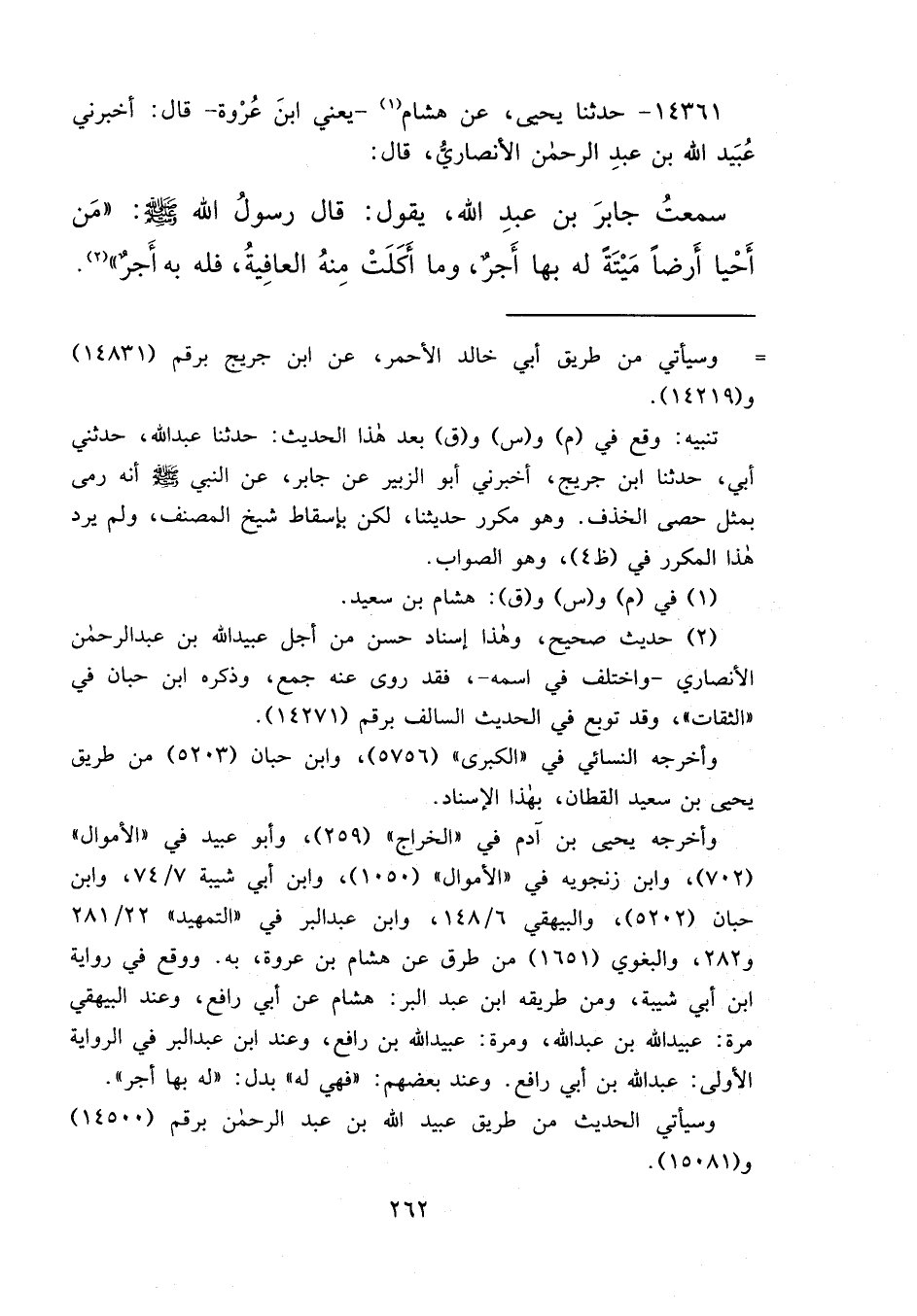١٤٣٦١ - حَدَّثَنَا يَحْيَى، عَنْ هِشَامِ (١) يَعْنِي ابْنَ عُرْوَةَ، قَالَ: أَخْبَرَنِي عُبَيْدُ اللهِ بْنُ عَبْدِ الرَّحْمَنِ الْأَنْصَارِيُّ، قَالَ: سَمِعْتُ جَابِرَ بْنَ عَبْدِ اللهِ، يَقُولُ: قَالَ رَسُولُ اللهِ صَلَّى اللهُ عَلَيْهِ وَسَلَّمَ: " مَنْ أَحْيَا أَرْضًا مَيْتَةً لَهُ بِهَا أَجْرٌ، وَمَا أَكَلَتْ مِنْهُ الْعَافِيَةُ فَلَهُ بِهِ أَجْرٌ " (٢)