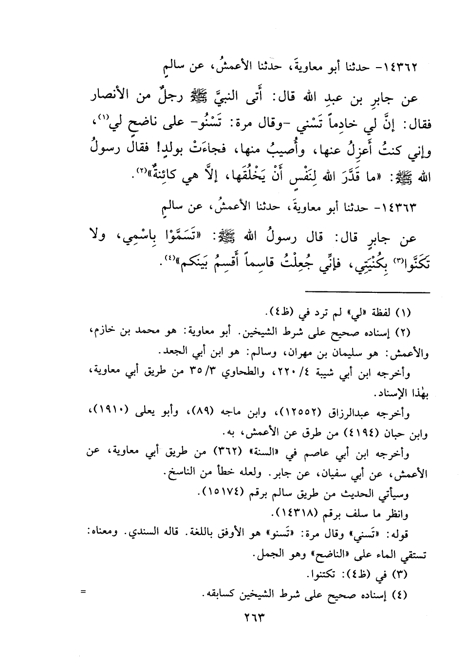 ١٤٣٦٣ - حَدَّثَنَا أَبُو مُعَاوِيَةَ، حَدَّثَنَا الْأَعْمَشُ، عَنْ سَالِمٍ، عَنْ جَابِرٍ، قَالَ: قَالَ رَسُولُ اللهِ صَلَّى اللهُ عَلَيْهِ وَسَلَّمَ: " تَسَمَّوْا بِاسْمِي، وَلَا تَكَنَّوْا (٣) بِكُنْيَتِي، فَإِنِّي جُعِلْتُ قَاسِمًا أَقْسِمُ بَيْنَكُمْ " (٤)