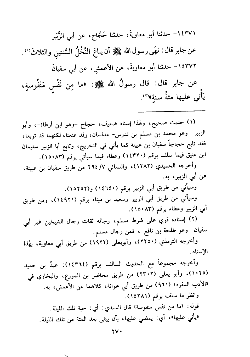 ١٤٣٧١ - حَدَّثَنَا أَبُو مُعَاوِيَةَ، حَدَّثَنَا حَجَّاجٌ، عَنْ أَبِي الزُّبَيْرِ، عَنْ جَابِرٍ، قَالَ: " نَهَى رَسُولُ اللهِ صَلَّى اللهُ عَلَيْهِ وَسَلَّمَ أَنْ يُبَاعَ النَّخْلُ السَّنَتَيْنِ، وَالثَّلَاثَ " (١)