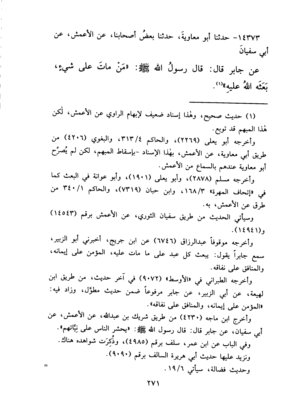١٤٣٧٣ - حَدَّثَنَا أَبُو مُعَاوِيَةَ، حَدَّثَنَا بَعْضُ، أَصْحَابِنَا، عَنِ الْأَعْمَشِ، عَنْ أَبِي سُفْيَانَ، عَنْ جَابِرٍ، قَالَ: قَالَ رَسُولُ اللهِ صَلَّى اللهُ عَلَيْهِ وَسَلَّمَ: " مَنْ مَاتَ عَلَى شَيْءٍ بَعَثَهُ اللهُ عَلَيْهِ " (١)