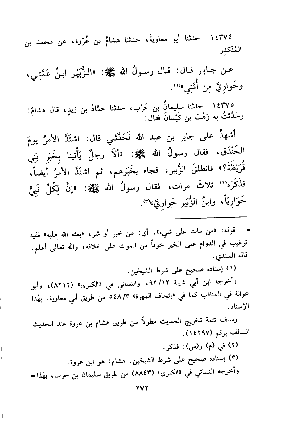 ١٤٣٧٥ - حَدَّثَنَا سُلَيْمَانُ بْنُ حَرْبٍ، حَدَّثَنَا حَمَّادُ بْنُ زَيْدٍ، قَالَ هِشَامٌ، وَحَدَّثْتُ بِهِ وَهْبَ بْنَ كَيْسَانَ، فَقَالَ: أَشْهَدُ عَلَى جَابِرِ بْنِ عَبْدِ اللهِ، لَحَدَّثَنِي، قَالَ: اشْتَدَّ الْأَمْرُ يَوْمَ الْخَنْدَقِ، فَقَالَ رَسُولُ اللهِ صَلَّى اللهُ عَلَيْهِ وَسَلَّمَ: " أَلَا رَجُلٌ يَأْتِينَا بِخَبَرِ بَنِي قُرَيْظَةَ؟ "، فَانْطَلَقَ الزُّبَيْرُ، فَجَاءَ بِخَبَرِهِمْ، ثُمَّ اشْتَدَّ الْأَمْرُ أَيْضًا، فَذَكَرَهُ (٢) ثَلَاثَ مَرَّاتٍ، فَقَالَ رَسُولُ اللهِ صَلَّى اللهُ عَلَيْهِ وَسَلَّمَ: " إِنَّ لِكُلِّ نَبِيٍّ حَوَارِيًّا، وَابْنُ الزُّبَيْرَ حَوَارِيَّ " (٣)