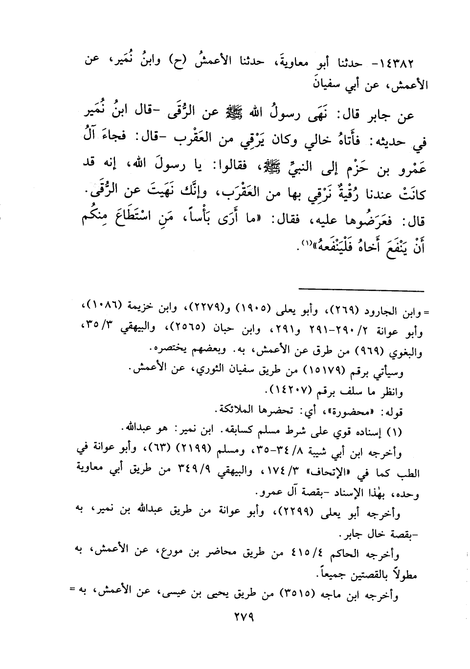 ١٤٣٨٢ - حَدَّثَنَا أَبُو مُعَاوِيَةَ، حَدَّثَنَا الْأَعْمَشُ، ح وَابْنُ نُمَيْرٍ، عَنِ الْأَعْمَشِ، عَنْ أَبِي سُفْيَانَ، عَنْ جَابِرٍ، قَالَ: " نَهَى رَسُولُ اللهِ صَلَّى اللهُ عَلَيْهِ وَسَلَّمَ عَنِ الرُّقَى " - قَالَ ابْنُ نُمَيْرٍ فِي حَدِيثِهِ: فَأَتَاهُ خَالِي، وَكَانَ يَرْقِي مِنَ الْعَقْرَبِ -، قَالَ: فَجَاءَ آلُ عَمْرِو بْنِ حَزْمٍ إِلَى النَّبِيِّ صَلَّى اللهُ عَلَيْهِ وَسَلَّمَ، فَقَالُوا: يَا رَسُولَ اللهِ، إِنَّهُ قَدْ كَانَتْ عِنْدَنَا رُقْيَةٌ نَرْقِي بِهَا مِنَ الْعَقْرَبِ، وَإِنَّكَ نَهَيْتَ عَنِ الرُّقَى، قَالَ: فَعَرَضُوهَا عَلَيْهِ، فَقَالَ: " مَا أَرَى بَأْسًا، مَنْ اسْتَطَاعَ مِنْكُمْ أَنْ يَنْفَعَ أَخَاهُ فَلْيَنْفَعْهُ " (١)