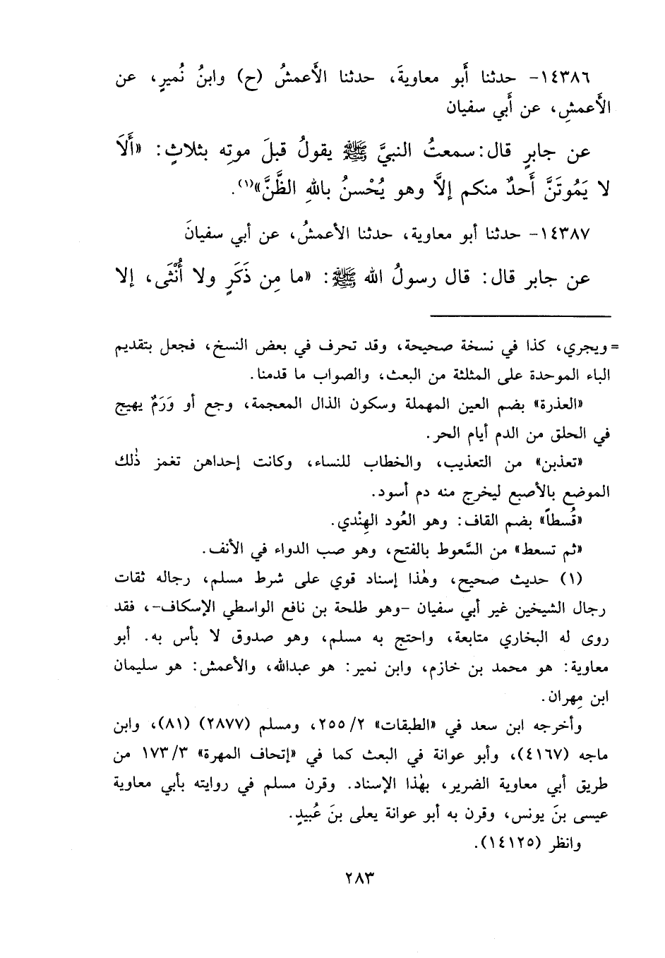 ١٤٣٨٦ - حَدَّثَنَا أَبُو مُعَاوِيَةَ، حَدَّثَنَا الْأَعْمَشُ، ح وَابْنُ نُمَيْرٍ، عَنْ الْأَعْمَشِ، عَنْ أَبِي سُفْيَانَ، عَنْ جَابِرٍ، قَالَ: سَمِعْتُ النَّبِيَّ صَلَّى اللهُ عَلَيْهِ وَسَلَّمَ يَقُولُ قَبْلَ مَوْتِهِ بِثَلَاثٍ: " أَلَا لَا يَمُوتَنَّ أَحَدٌ مِنْكُمْ إِلَّا وَهُوَ يُحْسِنُ بِاللهِ الظَّنَّ " (١)