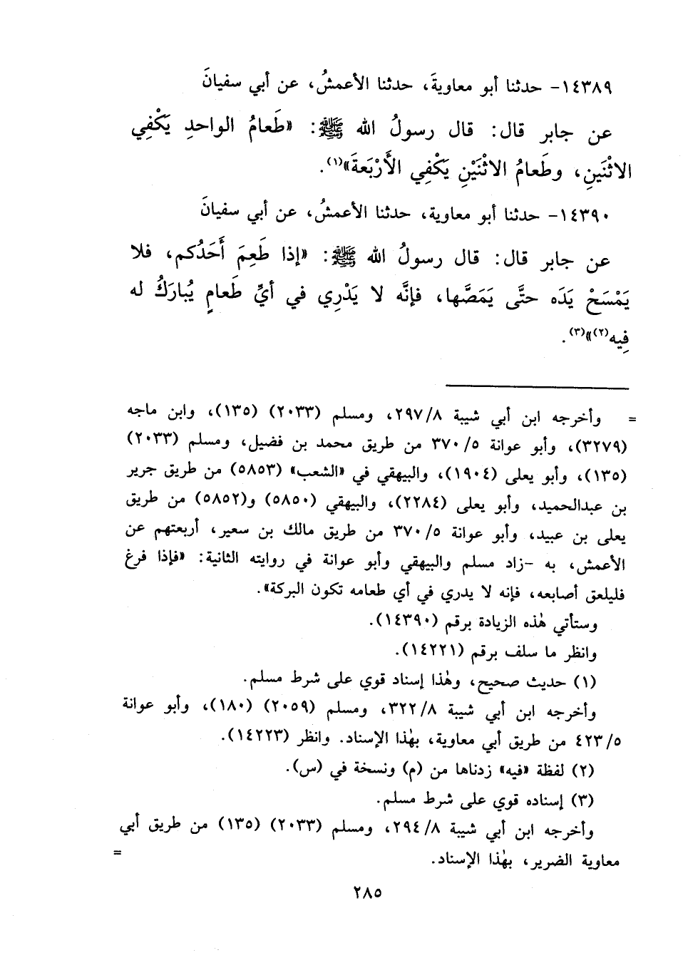 ١٤٣٨٩ - حَدَّثَنَا أَبُو مُعَاوِيَةَ، حَدَّثَنَا الْأَعْمَشُ عَنْ أَبِي سُفْيَانَ، عَنْ جَابِرٍ، قَالَ: قَالَ رَسُولُ اللهِ صَلَّى اللهُ عَلَيْهِ وَسَلَّمَ: " طَعَامُ الْوَاحِدِ يَكْفِي الِاثْنَيْنِ، وَطَعَامُ الِاثْنَيْنِ يَكْفِي الْأَرْبَعَةَ " (١)