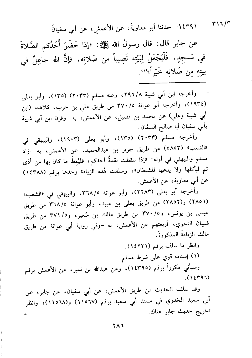 ١٤٣٩١ - حَدَّثَنَا أَبُو مُعَاوِيَةَ، عَنِ الْأَعْمَشُ، عَنْ أَبِي سُفْيَانَ، عَنْ جَابِرٍ، قَالَ: قَالَ رَسُولُ اللهِ صَلَّى اللهُ عَلَيْهِ وَسَلَّمَ: " إِذَا حَضَرَ أَحَدُكُمُ الصَّلَاةَ فِي مَسْجِدٍ، فَلْيَجْعَلْ لِبَيْتِهِ نَصِيبًا مِنْ صَلَاتِهِ، فَإِنَّ اللهَ جَاعِلٌ فِي بَيْتِهِ مِنْ صَلَاتِهِ خَيْرًا " (١)