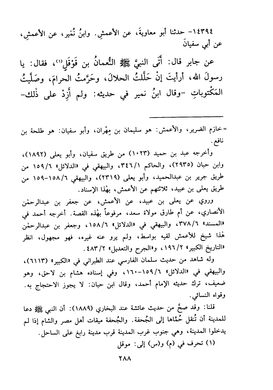 ١٤٣٩٤ - حَدَّثَنَا أَبُو مُعَاوِيَةَ، عَنْ الْأَعْمَشِ، وَابْنُ نُمَيْرٍ، عَنِ الْأَعْمَشُ، عَنْ أَبِي سُفْيَانَ، عَنْ جَابِرٍ، قَالَ: أَتَى النَّبِيَّ صَلَّى اللهُ عَلَيْهِ وَسَلَّمَ النُّعْمَانُ بْنُ قَوْقَلٍ، (١) فَقَالَ: يَا رَسُولَ اللهِ، أَرَأَيْتَ إِنْ حَلَّلْتُ الْحَلَالَ، وَحَرَّمْتُ الْحَرَامَ، وَصَلَّيْتُ الْمَكْتُوبَاتِ - وَقَالَ ابْنُ نُمَيْرٍ فِي حَدِيثِهِ: وَلَمْ أَزِدْ عَلَى ذَلِكَ