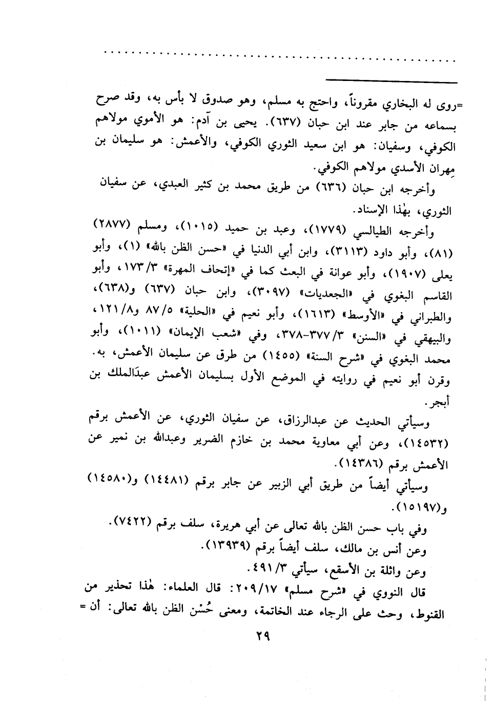 = روى له البخاري مقروناً، واحتج به مسلم، وهو صدوق لا بأس به، وقد صرح بسماعه من جابر عند ابن حبان (٦٣٧) . يحيى بن آدم: هو الأموي مولاهم الكوفي، وسفيان: هو ابن سعيد الثوري الكوفي، والأعمش: هو سليمان بن مِهران الأسدي مولاهم الكوفي.
