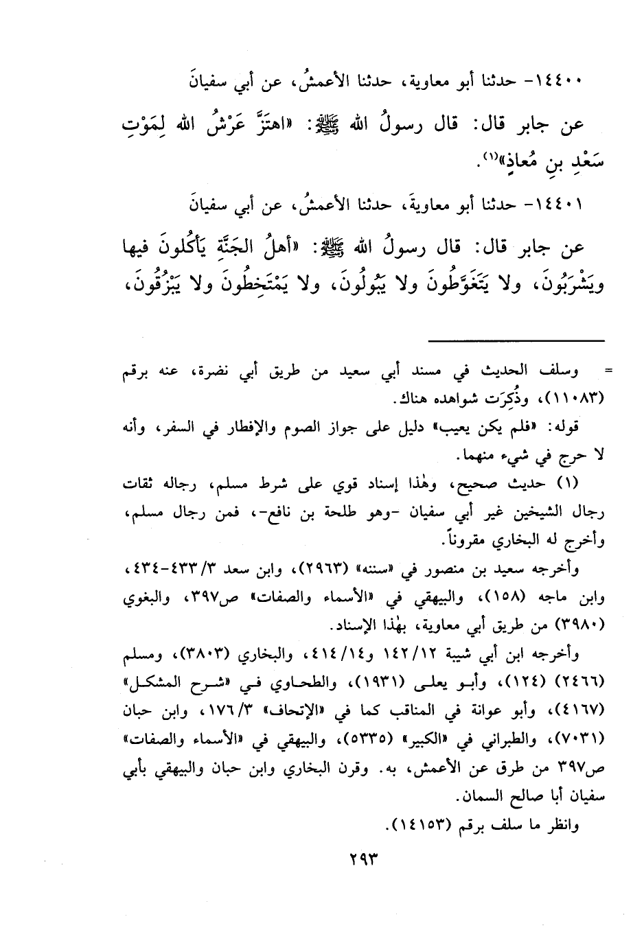 ١٤٤٠٠ - حَدَّثَنَا أَبُو مُعَاوِيَةَ، حَدَّثَنَا الْأَعْمَشُ، عَنْ أَبِي سُفْيَانَ، عَنْ جَابِرٍ، قَالَ: قَالَ رَسُولُ اللهِ صَلَّى اللهُ عَلَيْهِ وَسَلَّمَ: " اهْتَزَّ عَرْشُ اللهِ لِمَوْتِ سَعْدِ بْنِ مُعَاذٍ " (١)