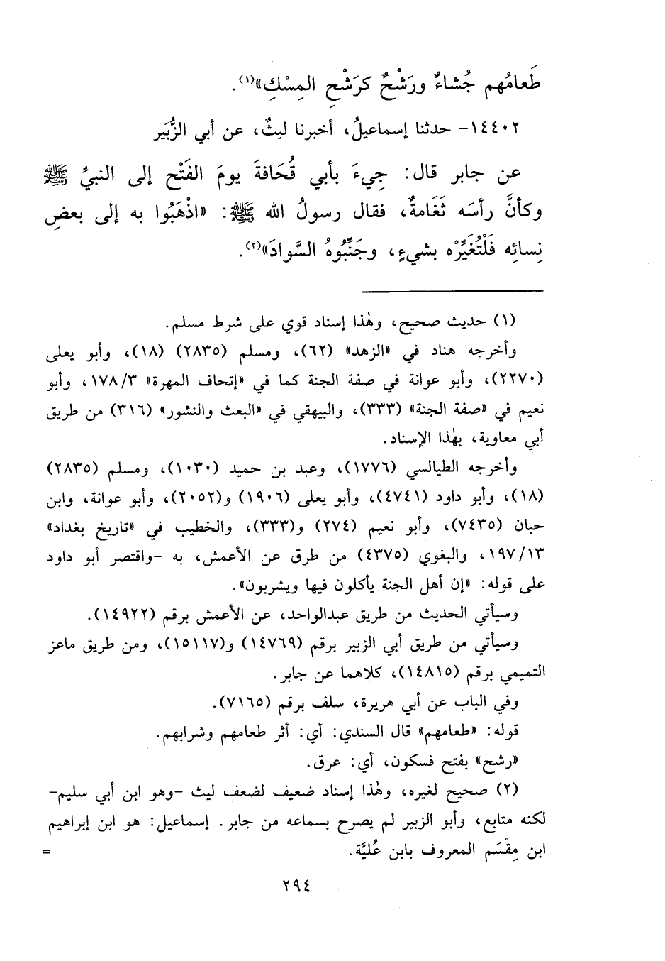 ١٤٤٠٢ - حَدَّثَنَا إِسْمَاعِيلُ، أَخْبَرَنَا لَيْثٌ، عَنْ أَبِي الزُّبَيْرِ، عَنْ جَابِرٍ، قَالَ: جِيءَ بِأَبِي قُحَافَةَ يَوْمَ الْفَتْحِ إِلَى النَّبِيِّ صَلَّى اللهُ عَلَيْهِ وَسَلَّمَ، وَكَأَنَّ رَأْسَهُ ثَغَامَةٌ، فَقَالَ رَسُولُ اللهِ صَلَّى اللهُ عَلَيْهِ وَسَلَّمَ: " اذْهَبُوا بِهِ إِلَى بَعْضِ نِسَائِهِ، فَلْيُغَيِّرْهُ بِشَيْءٍ، وَجَنِّبُوهُ السَّوَادَ " (٢)
