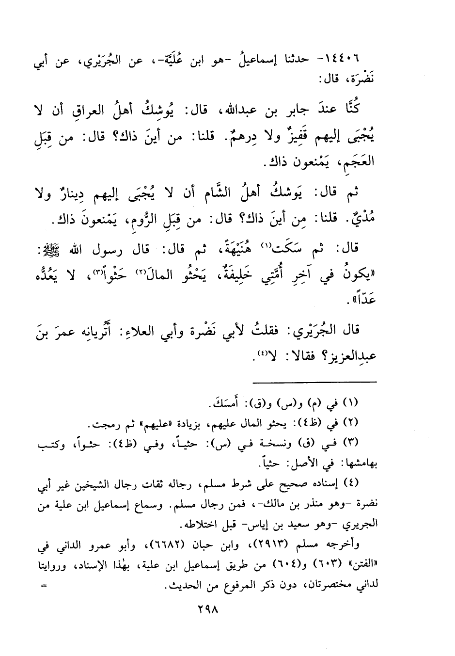 ١٤٤٠٦ - حَدَّثَنَا إِسْمَاعِيلُ هُوَ ابْنُ عُلَيَّةَ، عَنِ الْجُرَيْرِيِّ، عَنْ أَبِي نَضْرَةَ، قَالَ: كُنَّا عِنْدَ جَابِرِ بْنِ عَبْدِ اللهِ، قَالَ: يُوشِكُ أَهْلُ الْعِرَاقِ أَنْ لَا يُجْبَى إِلَيْهِمْ قَفِيزٌ، وَلَا دِرْهَمٌ، قُلْنَا: مِنْ أَيْنَ ذَاكَ؟ قَالَ: مِنْ قِبَلِ الْعَجْمِ، يُمْنَعُونَ ذَلِكَ، ثُمَّ قَالَ: يُوشِكُ أَهْلُ الشَّامِ أَنْ لَا يُجْبَى إِلَيْهِمْ دِينَارٌ، وَلَا مُدِّيٌّ، قُلْنَا: مِنْ أَيْنَ ذَاكَ؟ مِنْ قِبَلِ الرُّومِ يُمْنَعُونَ ذَاكَ، قَالَ: ثُمَّ سَكَتَ (١) هُنَيْهَةً، ثُمَّ قَالَ: قَالَ رَسُولُ اللهِ صَلَّى اللهُ عَلَيْهِ وَسَلَّمَ: " يَكُونُ فِي آخِرِ أُمَّتِي خَلِيفَةٌ، يَحْثُو الْمَالَ (٢) حَثْوًا، (٣) لَا يَعُدُّهُ عَدًّا "، قَالَ الْجُرَيْرِيُ: فَقُلْتُ لِأَبِي نَضْرَةَ: وَأَبِي الْعَلَاءِ: " أَتَرَيَانِهِ عُمَرَ بْنَ عَبْدِ الْعَزِيزِ؟ " فَقَالَا: " لَا " (٤)