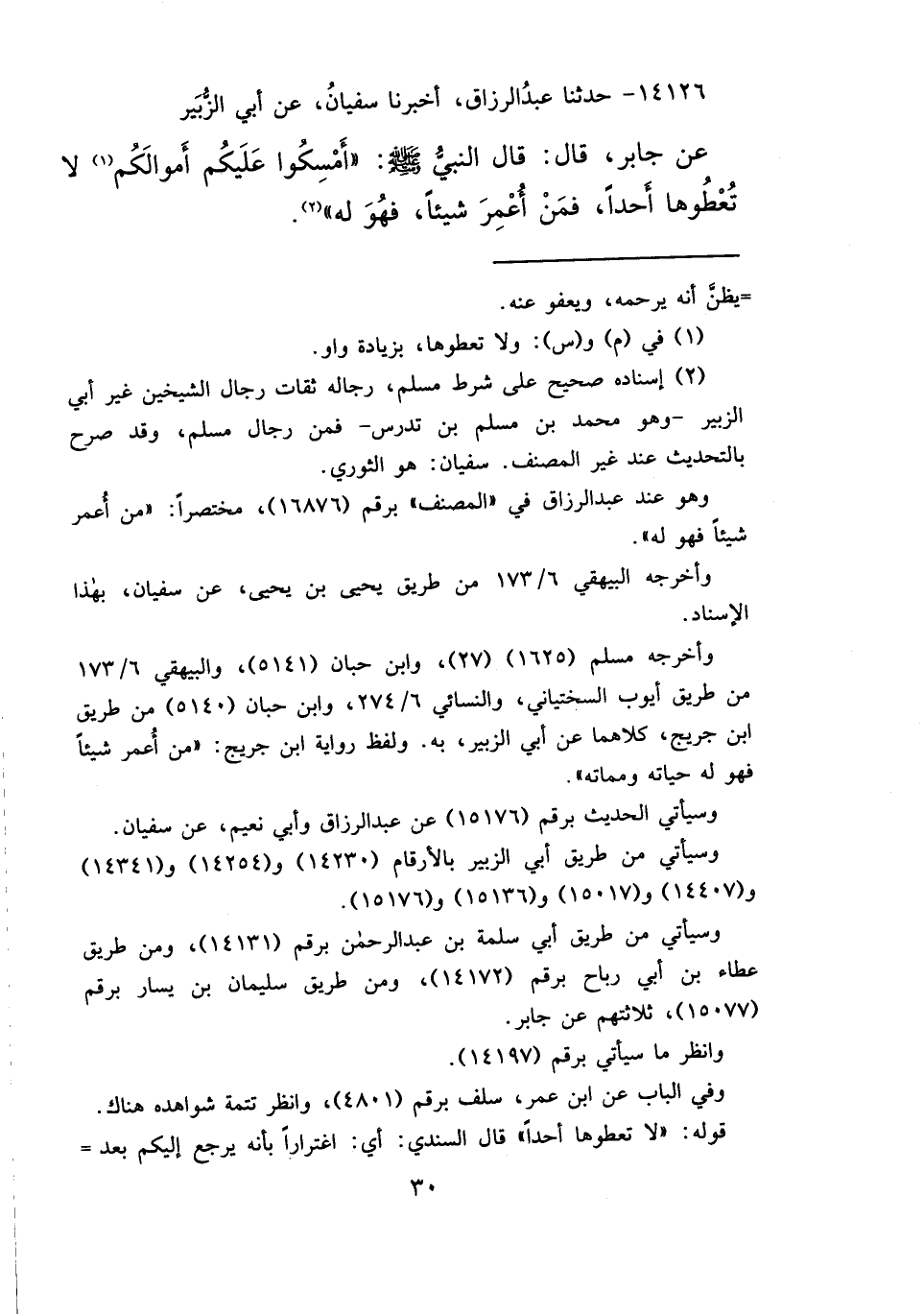 ١٤١٢٦ - حَدَّثَنَا عَبْدُ الرَّزَّاقِ، أَخْبَرَنَا سُفْيَانُ، عَنْ أَبِي الزُّبَيْرِ، عَنْ جَابِرٍ، قَالَ: قَالَ النَّبِيُّ صَلَّى اللهُ عَلَيْهِ وَسَلَّمَ: " أَمْسِكُوا عَلَيْكُمْ أَمْوَالَكُمْ (١) ، لَا تُعْطُوهَا أَحَدًا، فَمَنْ أُعْمِرَ شَيْئًا، فَهُوَ لَهُ " (٢)