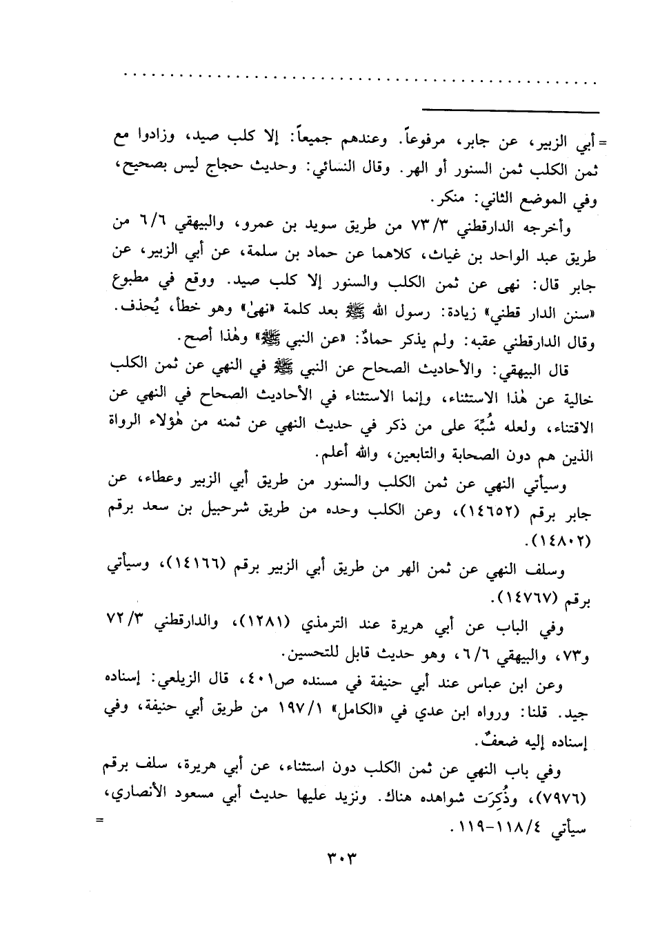 = أبي الزبير، عن جابر، مرفوعاً. وعندهم جميعاً: إلا كلب صيد، وزادوا مع ثمن الكلب ثمن السنور أو الهر. وقال النسائي: وحديث حجاج ليس بصحيح، وفي الموضع الثاني: منكر.