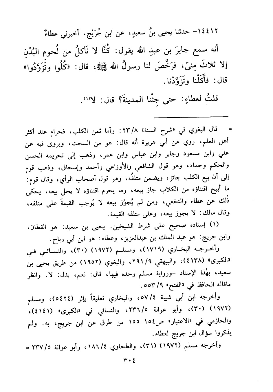 ١٤٤١٢ - حَدَّثَنَا يَحْيَى بْنُ سَعِيدٍ، عَنِ ابْنِ جُرَيْجٍ، أَخْبَرَنِي عَطَاءٌ، أَنَّهُ سَمِعَ جَابِرَ بْنَ عَبْدِ اللهِ، يَقُولُ: كُنَّا لَا نَأْكُلُ مِنْ لُحُومِ الْبُدْنِ إِلَّا ثَلَاثَ مِنًى، فَرَخَّصَ لَنَا رَسُولُ اللهِ صَلَّى اللهُ عَلَيْهِ وَسَلَّمَ، قَالَ: " كُلُوا، وَتَزَوَّدُوا "، قَالَ: فَأَكَلْنَا، وَتَزَوَّدْنَا، قُلْتُ لِعَطَاءٍ: حَتَّى جِئْنَا الْمَدِينَةَ؟ قَالَ: " لَا " (١)