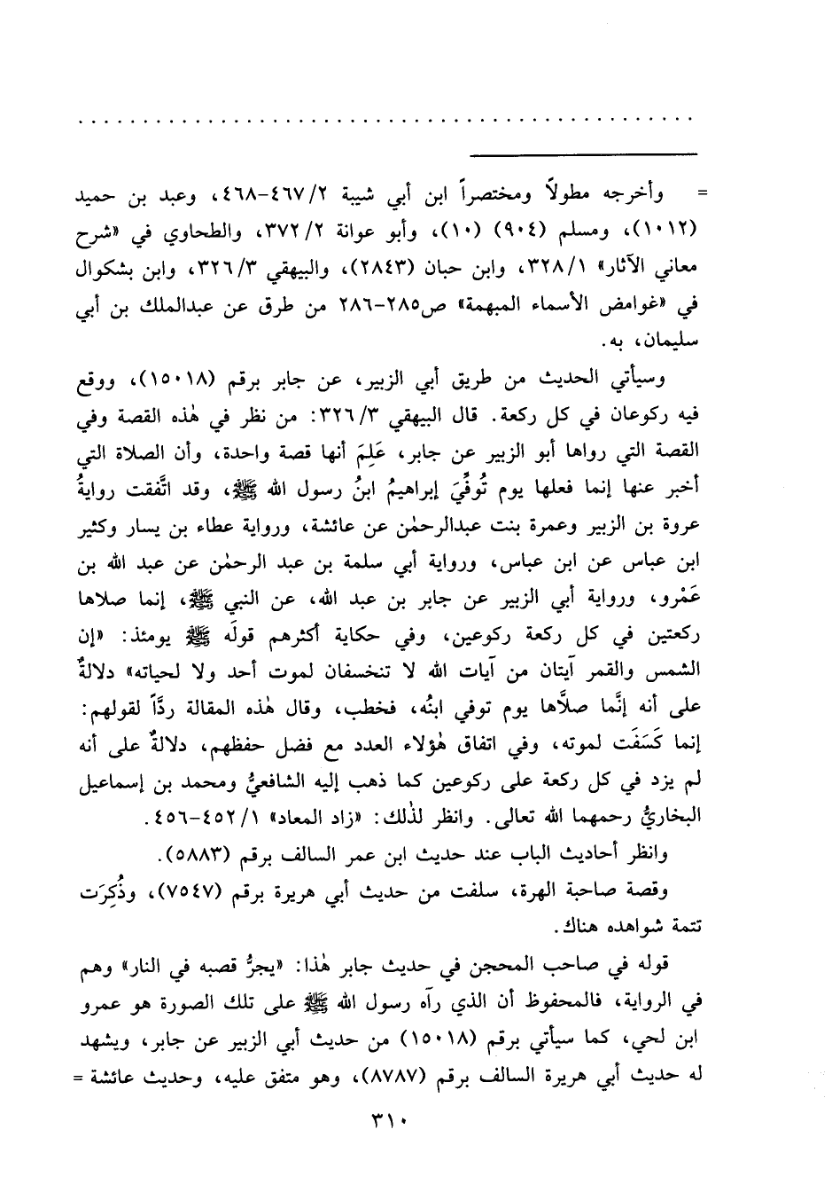 ركعتين في كل ركعة ركوعين، وفي حكاية أكثرهم قولَه صَلَّى اللهُ عَلَيْهِ وَسَلَّمَ يومئذ: "إن الشمس والقمر آيتان من آيات الله لا تنخسفان لموت أحد ولا لحياته" دلالة على أنه إنما صلاها يوم توفي ابنُه، فخطب، وقال هذه المقالة ردا لقولهم: إنما كَسَفَت لموته، وفي اتفاق هؤلاء العدد مع فضل حفظهم، دلالةٌ على أنه لم يزد في كل ركعة على ركوعين كما ذهب إليه الشافعي ومحمد بن إسماعيل البخاريُّ رحمهما الله تعالى. وانظر لذلك: "زاد المعاد" ١/٤٥٢-٤٥٦.