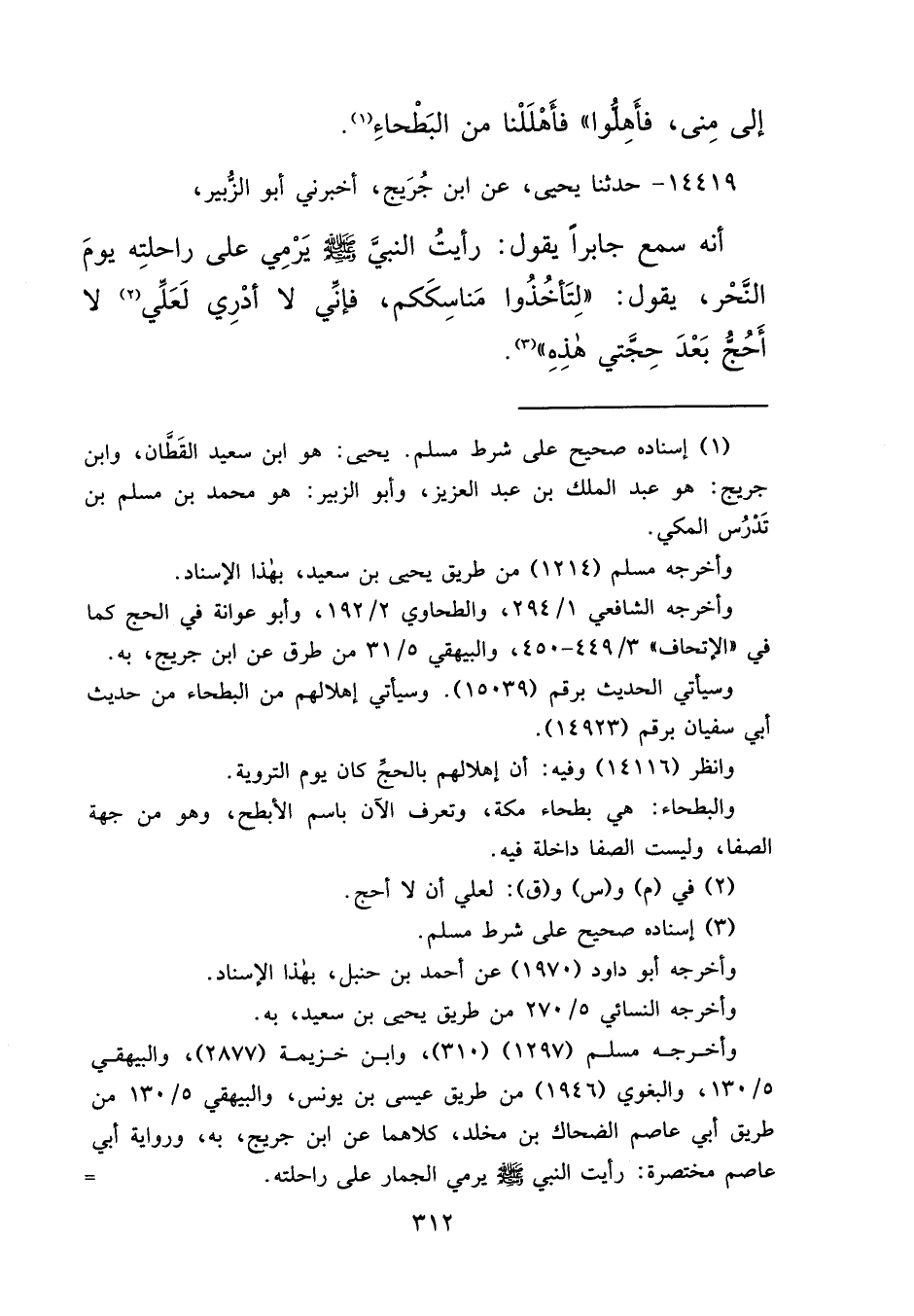 ١٤٤١٩ - حَدَّثَنَا يَحْيَى، عَنِ ابْنِ جُرَيْجٍ، أَخْبَرَنِي أَبُو الزُّبَيْرِ، أَنَّهُ: سَمِعَ جَابِرًا، يَقُولُ: رَأَيْتُ النَّبِيَّ صَلَّى اللهُ عَلَيْهِ وَسَلَّمَ يَرْمِي عَلَى رَاحِلَتِهِ يَوْمَ النَّحْرِ، يَقُولُ: " لِتَأْخُذُوا مَنَاسِكَكُمْ، فَإِنِّي لَا أَدْرِي لَعَلِّي (٢) لَا أَحُجَّ بَعْدَ حَجَّتِي هَذِهِ " (٣)