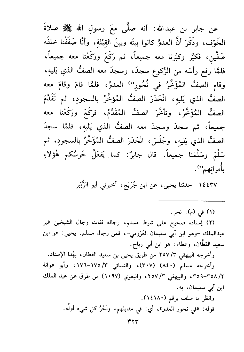 عَنْ جَابِرِ بْنِ عَبْدِ اللهِ، أَنَّهُ: " صَلَّى مَعَ رَسُولِ اللهِ صَلَّى اللهُ عَلَيْهِ وَسَلَّمَ صَلَاةَ الْخَوْفِ، وَذَكَرَ أَنَّ الْعَدُوَّ كَانُوا بَيْنَهُ وَبَيْنَ الْقِبْلَةِ، وَإِنَّا صَفَفْنَا خَلْفَهُ صَفَّيْنِ، فَكَبَّرَ وَكَبَّرْنَا مَعَهُ جَمِيعًا، ثُمَّ رَكَعَ وَرَكَعْنَا مَعَهُ جَمِيعًا، فَلَمَّا رَفَعَ رَأْسَهُ مِنَ الرُّكُوعِ سَجَدَ، وَسَجَدَ مَعَهُ الصَّفُّ الَّذِي يَلِيهِ، وَقَامَ الصَّفُّ الْمُؤَخَّرُ فِي نُحُورِ (١) الْعَدُوِّ، فَلَمَّا قَامَ وَقَامَ مَعَهُ الصَّفُّ الَّذِي يَلِيهِ، انْحَدَرَ الصَّفُّ الْمُؤَخَّرُ بِالسُّجُودِ، ثُمَّ تَقَدَّمَ الصَّفُّ الْمُؤَخَّرُ، وَتَأَخَّرَ الصَّفُّ الْمُقَدَّمُ، فَرَكَعَ وَرَكَعْنَا مَعَهُ جَمِيعًا، ثُمَّ سَجَدَ وَسَجَدَ مَعَهُ الصَّفُّ الَّذِي يَلِيهِ، فَلَمَّا سَجَدَ الصَّفُّ الَّذِي يَلِيهِ وَجَلَسَ، انْحَدَرَ الصَّفُّ الْمُؤَخَّرُ بِالسُّجُودِ، ثُمَّ سَلَّمَ وَسَلَّمْنَا جَمِيعًا "، قَالَ جَابِرٌ: " كَمَا يَفْعَلُ حَرَسُكُمْ هَؤُلَاءِ بِأُمَرَائِهِمْ " (٢)