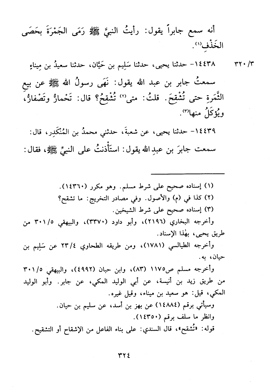 ١٤٤٣٨ - حَدَّثَنَا يَحْيَى، حَدَّثَنَا سَلِيمُ بْنُ حَيَّانَ، حَدَّثَنَا سَعِيدُ بْنُ مِينَاءَ، سَمِعْتُ جَابِرَ بْنَ عَبْدِ اللهِ، يَقُولُ: " نَهَى رَسُولُ اللهِ صَلَّى اللهُ عَلَيْهِ وَسَلَّمَ عَنْ بَيْعِ الثَّمَرِ حَتَّى تُشَقِّحَ "، قُلْتُ: مَتَى (٢) تُشَقِّحُ؟ قَالَ: " تَحْمَارُّ، أَوْ تَصْفَارُّ، وَيُؤْكَلُ مِنْهَا " (٣)