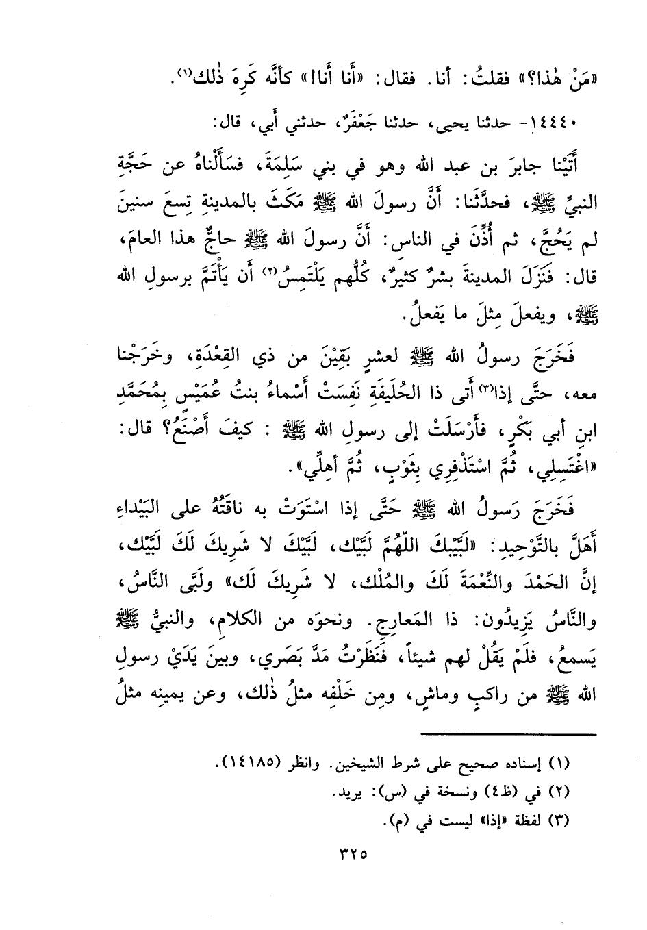 ١٤٤٤٠ - حَدَّثَنَا يَحْيَى، حَدَّثَنَا جَعْفَرٌ، حَدَّثَنِي أَبِي، قَالَ: أَتَيْنَا جَابِرَ بْنَ عَبْدِ اللهِ وَهُوَ فِي بَنِي سَلِمَةَ، فَسَأَلْنَاهُ عَنْ حَجَّةِ النَّبِيِّ صَلَّى اللهُ عَلَيْهِ وَسَلَّمَ، فَحَدَّثَنَا أَنَّ رَسُولَ اللهِ صَلَّى اللهُ عَلَيْهِ وَسَلَّمَ: مَكَثَ بِالْمَدِينَةِ تِسْعَ سِنِينَ لَمْ يَحُجَّ، ثُمَّ أُذِّنَ فِي النَّاسِ أَنَّ رَسُولَ اللهِ صَلَّى اللهُ عَلَيْهِ وَسَلَّمَ حَاجٌّ هَذَا الْعَامَ، قَالَ: فَنَزَلَ الْمَدِينَةَ بَشَرٌ كَثِيرٌ، كُلُّهُمْ يَلْتَمِسُ (٢) أَنْ يَأْتَمَّ بِرَسُولِ اللهِ صَلَّى اللهُ عَلَيْهِ وَسَلَّمَ، وَيَفْعَلَ مِثْلَ مَا يَفْعَلُ، فَخَرَجَ رَسُولُ اللهِ صَلَّى اللهُ عَلَيْهِ وَسَلَّمَ، لِعَشْرٍ بَقِينَ مِنْ ذِي الْقَعْدَةِ، وَخَرَجْنَا مَعَهُ حَتَّى إِذَا (٣) أَتَى ذَا الْحُلَيْفَةِ، نُفِسَتْ أَسْمَاءُ بِنْتُ عُمَيْسٍ بِمُحَمَّدِ بْنِ أَبِي بَكْرٍ، فَأَرْسَلَتْ إِلَى رَسُولِ اللهِ صَلَّى اللهُ عَلَيْهِ وَسَلَّمَ: كَيْفَ أَصْنَعُ؟، قَالَ: " اغْتَسِلِي، ثُمَّ اسْتَذْفِرِي بِثَوْبٍ، ثُمَّ أَهِلِّي "، فَخَرَجَ رَسُولُ اللهِ صَلَّى اللهُ عَلَيْهِ وَسَلَّمَ، حَتَّى إِذَا اسْتَوَتْ بِهِ نَاقَتُهُ عَلَى الْبَيْدَاءِ، أَهَلَّ بِالتَّوْحِيدِ: " لَبَّيْكَ اللهُمَّ لَبَّيْكَ، لَبَّيْكَ لَا شَرِيكَ لَكَ لَبَّيْكَ، إِنَّ الْحَمْدَ، وَالنِّعْمَةَ، لَكَ وَالْمُلْكَ، لَا شَرِيكَ لَكَ "، وَلَبَّى النَّاسُ، وَالنَّاسُ يَزِيدُونَ ذَا الْمَعَارِجِ، وَنَحْوَهُ مِنَ الْكَلَامِ، وَالنَّبِيُّ صَلَّى اللهُ عَلَيْهِ وَسَلَّمَ، يَسْمَعُ، فَلَمْ يَقُلْ لَهُمْ شَيْئًا، فَنَظَرْتُ مَدَّ بَصَرِي، وَبَيْنَ يَدَيْ رَسُولِ اللهِ صَلَّى اللهُ عَلَيْهِ وَسَلَّمَ مِنْ رَاكِبٍ، وَمَاشٍ، وَمِنْ خَلْفِهِ مِثْلُ ذَلِكَ، وَعَنْ يَمِينِهِ مِثْلُ