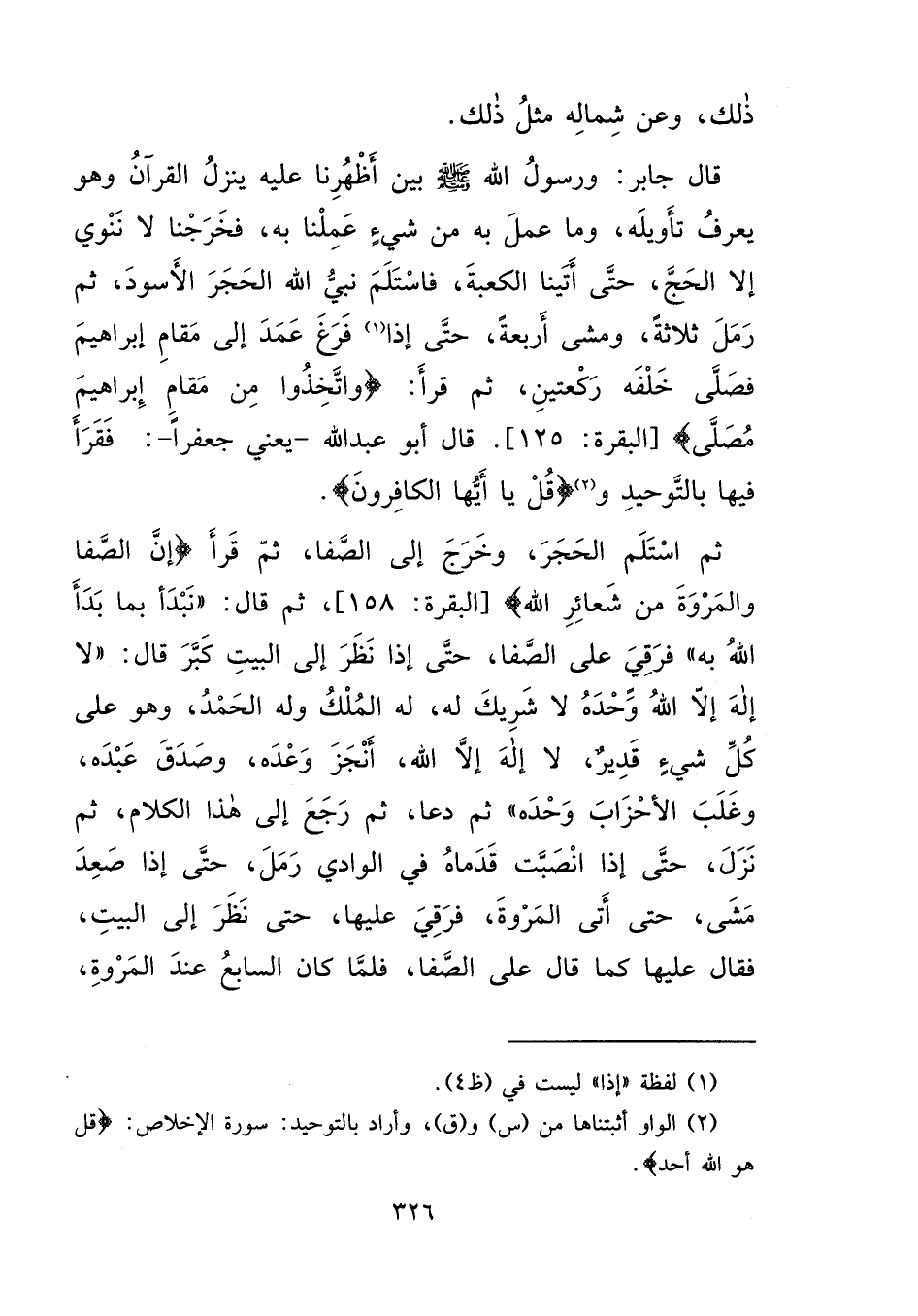 ذَلِكَ، وَعَنْ شِمَالِهِ مِثْلُ ذَلِكَ، قَالَ جَابِرٌ: وَرَسُولُ اللهِ صَلَّى اللهُ عَلَيْهِ وَسَلَّمَ، بَيْنَ أَظْهُرِنَا عَلَيْهِ يَنْزِلُ الْقُرْآنُ، وَهُوَ يَعْرِفُ تَأْوِيلَهُ، وَمَا عَمِلَ بِهِ مِنْ شَيْءٍ عَمِلْنَا بِهِ، فَخَرَجْنَا لَا نَنْوِي إِلَّا الْحَجَّ، حَتَّى أَتَيْنَا الْكَعْبَةَ، فَاسْتَلَمَ نَبِيُّ اللهِ الْحَجَرَ الْأَسْوَدَ، ثُمَّ رَمَلَ ثَلَاثَةً، وَمَشَى أَرْبَعَةً، حَتَّى إِذَا (١) فَرَغَ، عَمَدَ إِلَى مَقَامِ إِبْرَاهِيمَ فَصَلَّى خَلْفَهُ رَكْعَتَيْنِ، ثُمَّ قَرَأَ، {وَاتَّخِذُوا مِنْ مَقَامِ إِبْرَاهِيمَ مُصَلًّى} [البقرة: ١٢٥]- قَالَ أَبُو عَبْدِ اللهِ يَعْنِي جَعْفَرًا: - فَقَرَأَ فِيهَا بِالتَّوْحِيدِ، وَ (٢) قُلْ يَا أَيُّهَا الْكَافِرُونَ، ثُمَّ اسْتَلَمَ الْحَجَرَ، وَخَرَجَ إِلَى الصَّفَا، ثُمَّ قَرَأَ {إِنَّ الصَّفَا وَالْمَرْوَةَ مِنْ شَعَائِرِ اللهِ} [البقرة: ١٥٨] ، ثُمَّ قَالَ: " نَبْدَأُ بِمَا بَدَأَ اللهُ بِهِ "، فَرَقِيَ عَلَى الصَّفَا حَتَّى إِذَا نَظَرَ إِلَى الْبَيْتِ كَبَّرَ، قَالَ: " لَا إِلَهَ إِلَّا اللهُ وَحْدَهُ لَا شَرِيكَ لَهُ، لَهُ الْمُلْكُ، وَلَهُ الْحَمْدُ، وَهُوَ عَلَى كُلِّ شَيْءٍ قَدِيرٌ، لَا إِلَهَ إِلَّا اللهُ، أَنْجَزَ وَعْدَهُ، وَصَدَقَ عَبْدَهُ، وَغَلَبَ الْأَحْزَابَ وَحْدَهُ "، ثُمَّ دَعَا، ثُمَّ رَجَعَ إِلَى هَذَا الْكَلَامِ، ثُمَّ نَزَلَ حَتَّى إِذَا انْصَبَّتْ قَدَمَاهُ فِي الْوَادِي، رَمَلَ، حَتَّى إِذَا صَعِدَ مَشَى، حَتَّى أَتَى الْمَرْوَةَ، فَرَقِيَ عَلَيْهَا، حَتَّى نَظَرَ إِلَى الْبَيْتِ، فَقَالَ عَلَيْهَا كَمَا قَالَ عَلَى الصَّفَا، فَلَمَّا كَانَ السَّابِعُ عِنْدَ الْمَرْوَةِ،