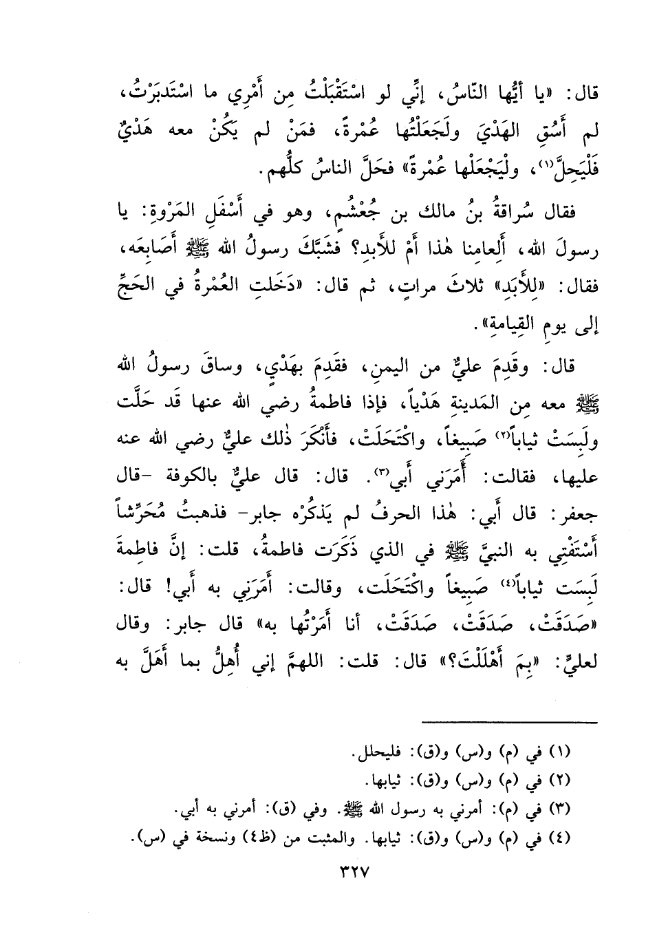 قَالَ: " يَا أَيُّهَا النَّاسُ، إِنِّي لَوِ اسْتَقْبَلْتُ مِنْ أَمْرِي مَا اسْتَدْبَرْتُ، لَمْ أَسُقِ الْهَدْيَ، وَلَجَعَلْتُهَا عُمْرَةً، فَمَنْ لَمْ يَكُنْ مَعَهُ هَدْيٌ فَلْيَحِلَّ (١) وَلْيَجْعَلْهَا عُمْرَةً "، فَحَلَّ النَّاسُ كُلُّهُمْ، فَقَالَ سُرَاقَةُ بْنُ مَالِكِ بْنِ جُعْشُمٍ، وَهُوَ فِي أَسْفَلِ الْمَرْوَةِ: يَا رَسُولَ اللهِ، أَلِعَامِنَا هَذَا، أَمْ لِلْأَبَدِ؟ فَشَبَّكَ رَسُولُ اللهِ صَلَّى اللهُ عَلَيْهِ وَسَلَّمَ أَصَابِعَهُ، فَقَالَ: " لِلْأَبَدِ "، ثَلَاثَ مَرَّاتٍ، ثُمَّ قَالَ: " دَخَلَتِ الْعُمْرَةُ فِي الْحَجِّ إِلَى يَوْمِ الْقِيَامَةِ "، قَالَ: وَقَدِمَ عَلِيٌّ مِنَ الْيَمَنِ، فَقَدِمَ بِهَدْيٍ وَسَاقَ رَسُولُ اللهِ صَلَّى اللهُ عَلَيْهِ وَسَلَّمَ مَعَهُ مِنَ الْمَدِينَةِ هَدْيًا، فَإِذَا فَاطِمَةُ رَضِيَ اللهُ عَنْهَا قَدْ حَلَّتْ، وَلَبِسَتْ ثِيَابًا (٢) صَبِيغًا، وَاكْتَحَلَتْ، فَأَنْكَرَ ذَلِكَ عَلِيٌّ رَضِيَ اللهُ عَنْهُ عَلَيْهَا، فَقَالَتْ: أَمَرَنِي أَبِي، (٣) قَالَ: قَالَ عَلِيٌّ بِالْكُوفَةِ - قَالَ جَعْفَرٌ: قَالَ أَبِي: هَذَا الْحَرْفُ لَمْ يَذْكُرْهُ جَابِرٌ - فَذَهَبْتُ مُحَرِّشًا أَسْتَفْتِي بِهِ النَّبِيَّ صَلَّى اللهُ عَلَيْهِ وَسَلَّمَ فِي الَّذِي ذَكَرَتْ فَاطِمَةُ، قُلْتُ: إِنَّ فَاطِمَةَ لَبِسَتْ ثِيَابًا (٤) صَبِيغًا، وَاكْتَحَلَتْ، وَقَالَتْ: أَمَرَنِي بِهِ أَبِي، قَالَ: " صَدَقَتْ، صَدَقَتْ، صَدَقَتْ، أَنَا أَمَرْتُهَا بِهِ "، قَالَ جَابِرٌ: وَقَالَ لِعَلِيٍّ: " بِمَ أَهْلَلْتَ؟ " قَالَ: قُلْتُ: اللهُمَّ إِنِّي أُهِلُّ بِمَا أَهَلَّ بِهِ