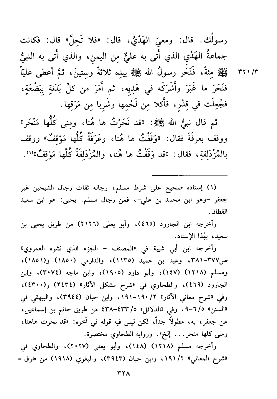 رَسُولُكَ، قَالَ: وَمَعِي الْهَدْيُ، قَالَ: " فَلَا تَحِلَّ " قَالَ: فَكَانَتْ جَمَاعَةُ الْهَدْيِ الَّذِي أَتَى بِهِ عَلِيٌّ مِنَ الْيَمَنِ، وَالَّذِي أَتَى بِهِ النَّبِيُّ صَلَّى اللهُ عَلَيْهِ وَسَلَّمَ مِائَةً، فَنَحَرَ رَسُولُ اللهِ صَلَّى اللهُ عَلَيْهِ وَسَلَّمَ بِيَدِهِ ثَلَاثَةً وَسِتِّينَ، ثُمَّ أَعْطَى عَلِيًّا فَنَحَرَ مَا غَبَرَ، وَأَشْرَكَهُ فِي هَدْيِهِ، ثُمَّ أَمَرَ مِنْ كُلِّ بَدَنَةٍ بِبَضْعَةٍ، فَجُعِلَتْ فِي قِدْرٍ، فَأَكَلَا مِنْ لَحْمِهَا، وَشَرِبَا مِنْ مَرَقِهَا، ثُمَّ قَالَ نَبِيُّ اللهِ صَلَّى اللهُ عَلَيْهِ وَسَلَّمَ: " قَدْ نَحَرْتُ هَاهُنَا، وَمِنًى كُلُّهَا مَنْحَرٌ "، وَوَقَفَ بِعَرَفَةَ، فَقَالَ: " وَقَفْتُ هَاهُنَا، وَعَرَفَةُ كُلُّهَا مَوْقِفٌ "، وَوَقَفَ بِالْمُزْدَلِفَةِ، فَقَالَ: " قَدْ وَقَفْتُ هَاهُنَا، وَالْمُزْدَلِفَةُ كُلُّهَا مَوْقِفٌ " (١)