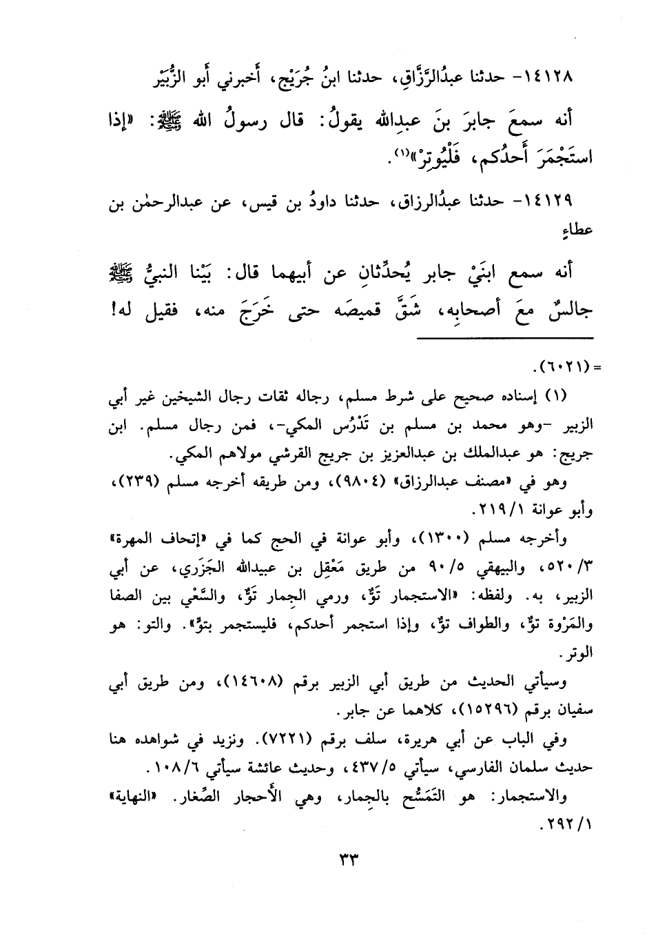 ١٤١٢٨ - حَدَّثَنَا عَبْدُ الرَّزَّاقِ، حَدَّثَنَا ابْنِ جُرَيْجٍ، أَخْبَرَنِي أَبُو الزُّبَيْرِ، أَنَّهُ: سَمِعَ جَابِرَ بْنَ عَبْدِ اللهِ، يَقُولُ: قَالَ رَسُولُ اللهِ صَلَّى اللهُ عَلَيْهِ وَسَلَّمَ: " إِذَا اسْتَجْمَرَ أَحَدُكُمْ، فَلْيُوتِرْ " (١)