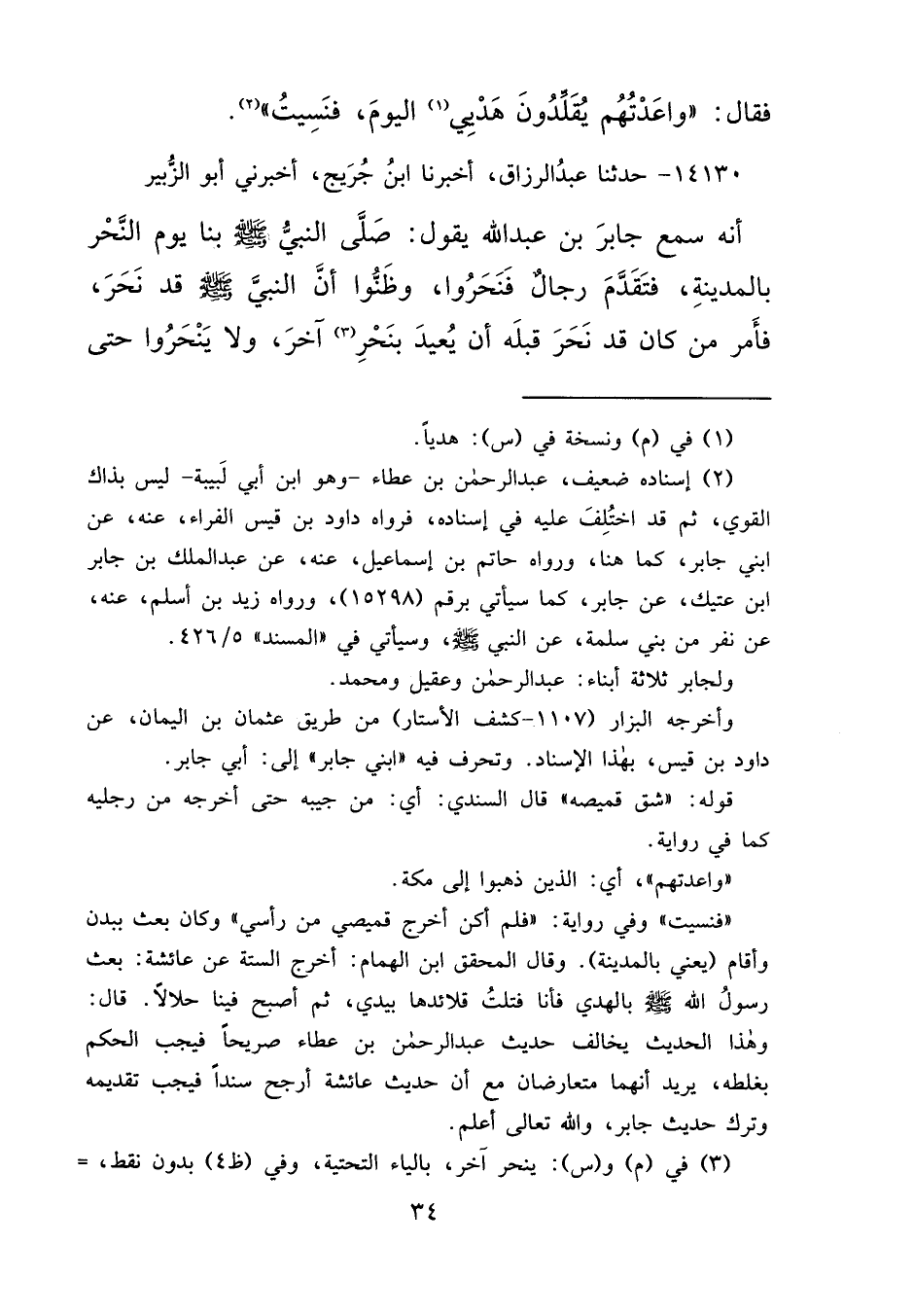 ١٤١٣٠ - حَدَّثَنَا عَبْدُ الرَّزَّاقِ، أَخْبَرَنَا ابْنُ جُرَيْجٍ، أَخْبَرَنِي أَبُو الزُّبَيْرِ، أَنَّهُ: سَمِعَ جَابِرَ بْنَ عَبْدِ اللهِ، يَقُولُ: " صَلَّى النَّبِيُّ صَلَّى اللهُ عَلَيْهِ وَسَلَّمَ بِنَا يَوْمَ النَّحْرِ بِالْمَدِينَةِ، فَتَقَدَّمَ رِجَالٌ فَنَحَرُوا، وَظَنُّوا أَنَّ النَّبِيَّ صَلَّى اللهُ عَلَيْهِ وَسَلَّمَ قَدْ نَحَرَ، فَأَمَرَ مَنْ كَانَ قَدْ نَحَرَ قَبْلَهُ أَنْ يُعِيدَ بِنَحْرٍ (٣) آخَرَ، وَلَا وَلَا يَنْحَرُوا حَتَّى