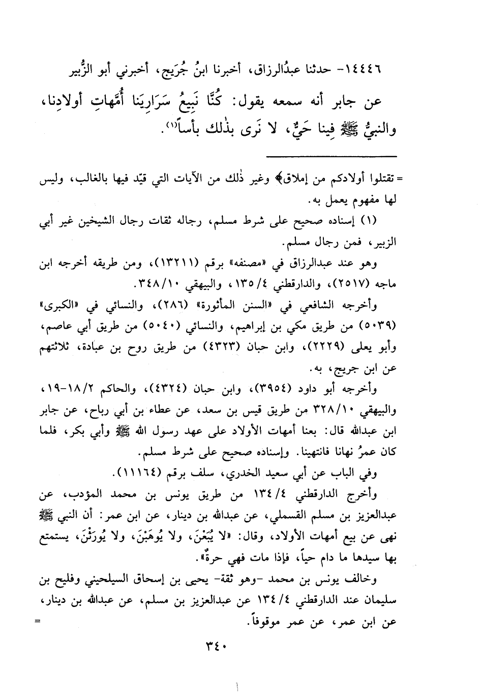 ١٤٤٤٦ - حَدَّثَنَا عَبْدُ الرَّزَّاقِ، أَخْبَرَنَا ابْنُ جُرَيْجٍ، أَخْبَرَنِي أَبُو الزُّبَيْرِ، عَنْ جَابِرٍ أَنَّهُ سَمِعَهُ يَقُولُ: " إِنَّا كُنَّا نَبِيعُ سَرَارِيَّنَا أُمَّهَاتِ أَوْلَادِنَا، وَالنَّبِيُّ صَلَّى اللهُ عَلَيْهِ وَسَلَّمَ فِينَا حَيٌّ، لَا يَرَى بِذَلِكَ بَأْسًا " (١)