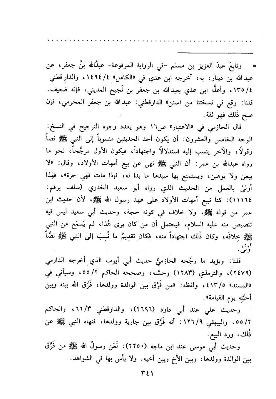 الوجه الخامس والعشرون: أن يكون أحد الحديثين منسوباً إلى النبي صَلَّى اللهُ عَلَيْهِ وَسَلَّمَ نصاً وقولاً، والآخر ينسب إليه استدلالاً واجتهاداً، فيكون الأول مرجحاً، نحو ما رواه عبد الله بن عمر: أن النبي صَلَّى اللهُ عَلَيْهِ وَسَلَّمَ نهى عن بيع أمهات الأولاد، وقال: "لا يبعن ولا يوهبن، ويستمتع بها سيدها ما بدا له، فإذا مات فهي حرة"، فهذا أولى بالعمل من الحديث الذي رواه أبو سعيد الخدري (سلف برقم: ١١١٦٤) : كنا نبيع أمهات الأولاد على عهد رسول الله صَلَّى اللهُ عَلَيْهِ وَسَلَّمَ، لأن حديث ابن عمر من قوله صَلَّى اللهُ عَلَيْهِ وَسَلَّمَ، ولا خلاف في كونه حجة، وحديث أبي سعيد ليس فيه تنصيص منه عليه السلام، فيحتمل أن من كان يرى هذا، لم يَسمَع من النبي صَلَّى اللهُ عَلَيْهِ وَسَلَّمَ خِلافَه، وكان ذلك اجتهاداَ منه، فكان تقديمُ ما نُسِبَ إلى النبي صَلَّى اللهُ عَلَيْهِ وَسَلَّمَ نصًّا أوْلَى.