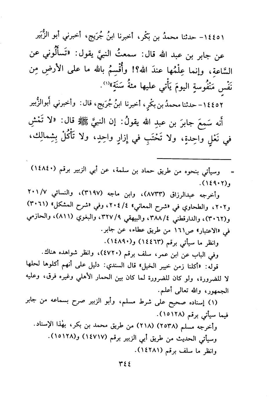 ١٤٤٥٢ - حَدَّثَنَا مُحَمَّدُ بْنُ بَكْرٍ، أَخْبَرَنَا ابْنُ جُرَيْجٍ، قَالَ: وَأَخْبَرَنِي أَبُو الزُّبَيْرِ، أَنَّهُ: سَمِعَ جَابِرَ بْنَ عَبْدِ اللهِ، يَقُولُ: إِنَّ النَّبِيَّ صَلَّى اللهُ عَلَيْهِ وَسَلَّمَ قَالَ: " لَا تَمْشِ فِي نَعْلٍ وَاحِدَةٍ، وَلَا تَحْتَبِ فِي إِزَارٍ وَاحِدٍ، وَلَا تَأْكُلْ بِشِمَالِكَ،