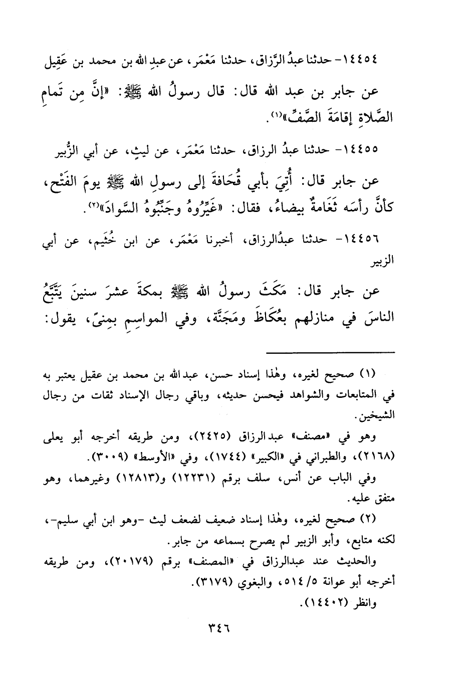 ١٤٤٥٤ - حَدَّثَنَا عَبْدُ الرَّزَّاقِ، حَدَّثَنَا مَعْمَرٌ، عَنْ عَبْدِ اللهِ بْنِ مُحَمَّدِ بْنِ عَقِيلٍ، عَنْ جَابِرِ بْنِ عَبْدِ اللهِ، قَالَ: قَالَ رَسُولُ اللهِ صَلَّى اللهُ عَلَيْهِ وَسَلَّمَ: " إِنَّ مِنْ تَمَامِ الصَّلَاةِ إِقَامَةَ الصَّفِّ " (١)