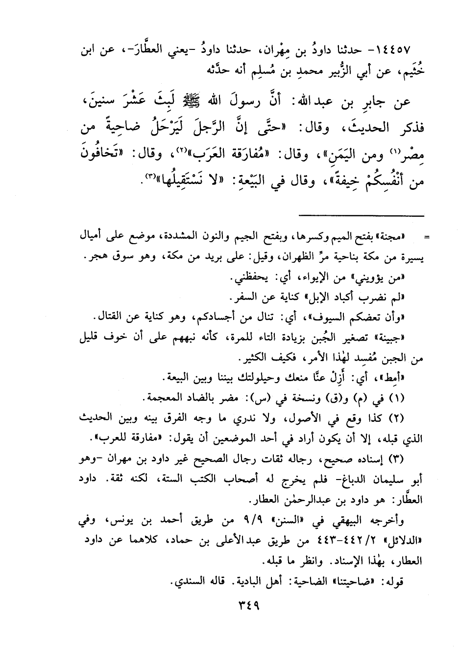 ١٤٤٥٧ - حَدَّثَنَا دَاوُدُ بْنُ مِهْرَانَ، حَدَّثَنَا دَاوُدُ يَعْنِي الْعَطَّارَ، عَنِ ابْنِ خُثَيْمٍ عَنْ أَبِي الزُّبَيْرِ مُحَمَّدِ بْنِ مُسْلِمٍ، أَنَّهُ حَدَّثَهُ: عَنْ جَابِرِ بْنِ عَبْدِ اللهِ، أَنَّ رَسُولَ اللهِ صَلَّى اللهُ عَلَيْهِ وَسَلَّمَ لَبِثَ عَشْرَ سِنِينَ، فَذَكَرَ الْحَدِيثَ، وَقَالَ: حَتَّى إِنَّ الرَّجُلَ لَيَرْحَلُ ضَاحِيَةً مِنْ مِصْرَ، (١) وَمِنَ الْيَمَنِ، وَقَالَ: مُفَارَقَةُ الْعَرَبِ، (٢) وَقَالَ: تَخَافُونَ مِنْ أَنْفُسِكُمْ خِيفَةً، وَقَالَ: فِي الْبَيْعَةِ لَا نَسْتَقِيلُهَا، (٣)