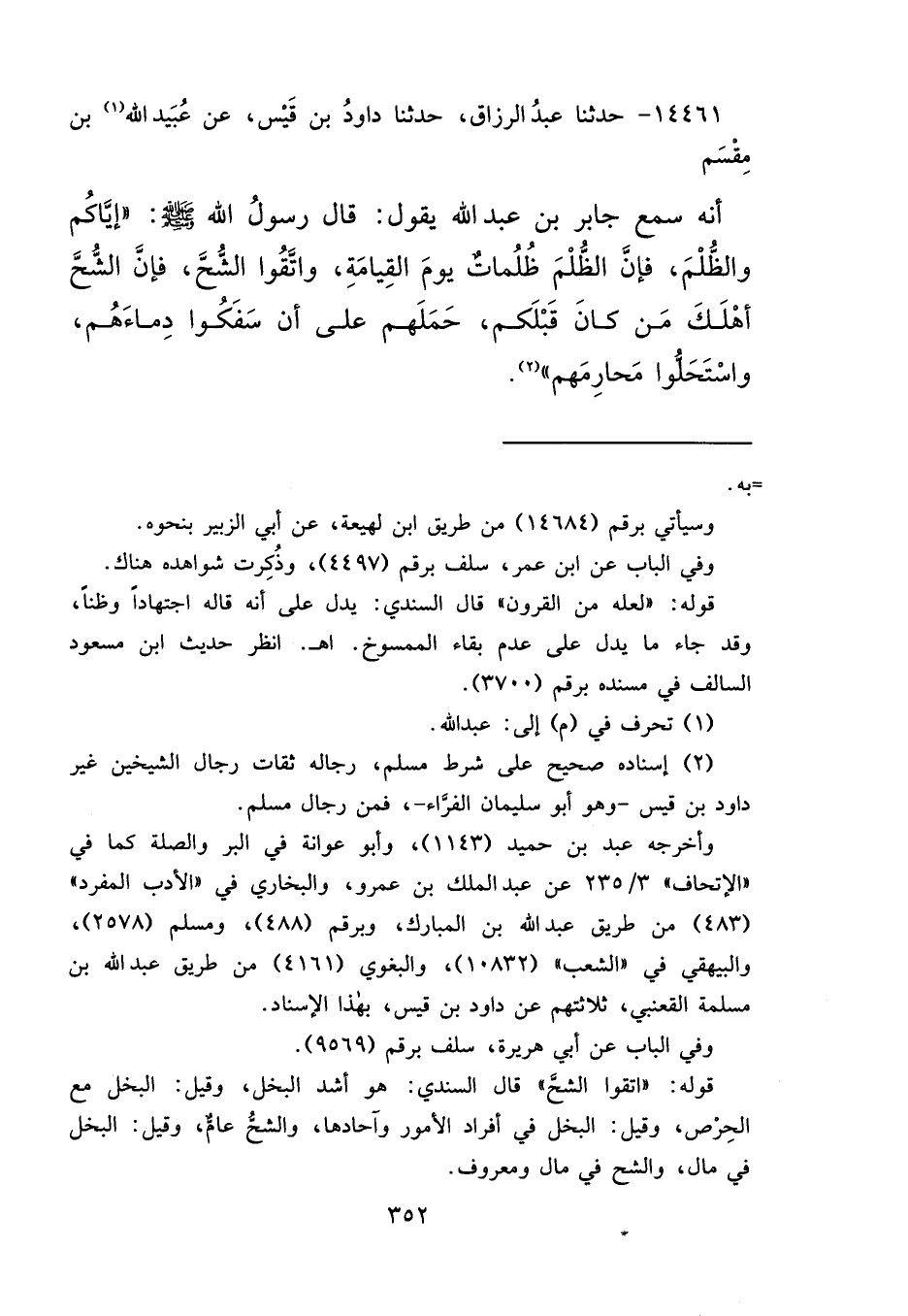 ١٤٤٦١ - حَدَّثَنَا عَبْدُ الرَّزَّاقِ، حَدَّثَنَا دَاوُدُ بْنُ قَيْسٍ، عَنْ عُبَيْدِ اللهِ (١) بْنِ مِقْسَمٍ، أَنَّهُ: سَمِعَ جَابِرَ بْنَ عَبْدِ اللهِ، يَقُولُ: قَالَ رَسُولُ اللهِ صَلَّى اللهُ عَلَيْهِ وَسَلَّمَ: إِيَّاكُمْ وَالظُّلْمَ، فَإِنَّ الظُّلْمَ ظُلُمَاتٌ يَوْمَ الْقِيَامَةِ، وَاتَّقُوا الشُّحَّ، فَإِنَّ الشُّحَّ أَهْلَكَ مَنْ كَانَ قَبْلَكُمْ، حَمَلَهُمْ عَلَى أَنْ سَفَكُوا دِمَاءَهُمْ، وَاسْتَحَلُّوا مَحَارِمَهُمْ " (٢)