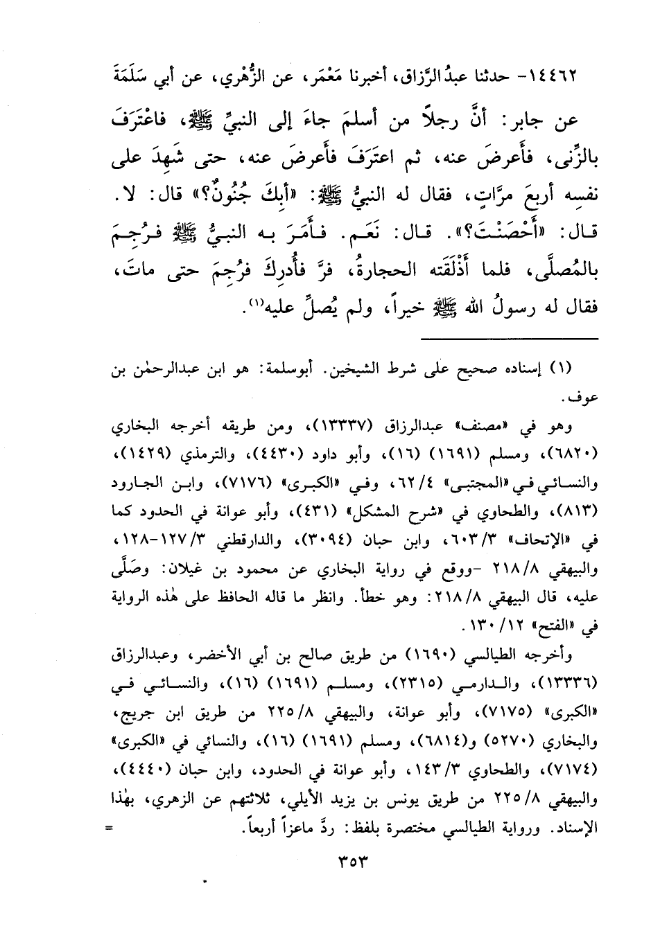 ١٤٤٦٢ - حَدَّثَنَا عَبْدُ الرَّزَّاقِ، أَخْبَرَنَا مَعْمَرٌ، عَنِ الزُّهْرِيِّ، عَنْ أَبِي سَلَمَةَ، عَنْ جَابِرٍ، أَنَّ رَجُلًا مِنْ أَسْلَمَ جَاءَ إِلَى النَّبِيِّ صَلَّى اللهُ عَلَيْهِ وَسَلَّمَ، فَاعْتَرَفَ بِالزِّنَا، فَأَعْرَضَ عَنْهُ، ثُمَّ اعْتَرَفَ، فَأَعْرَضَ عَنْهُ، حَتَّى شَهِدَ عَلَى نَفْسِهِ أَرْبَعَ مَرَّاتٍ، فَقَالَ لَهُ النَّبِيُّ صَلَّى اللهُ عَلَيْهِ وَسَلَّمَ: " أَبِكَ جُنُونٌ؟ "، قَالَ: لَا، قَالَ: " أَحْصَنْتَ "، قَالَ: نَعَمْ، فَأَمَرَ بِهِ النَّبِيُّ صَلَّى اللهُ عَلَيْهِ وَسَلَّمَ فَرُجِمَ بِالْمُصَلَّى، فَلَمَّا أَذْلَقَتْهُ الْحِجَارَةُ فَرَّ، فَأُدْرِكَ، فَرُجِمَ حَتَّى مَاتَ، فَقَالَ لَهُ رَسُولُ اللهِ صَلَّى اللهُ عَلَيْهِ وَسَلَّمَ خَيْرًا، وَلَمْ يُصَلِّ عَلَيْهِ (١)