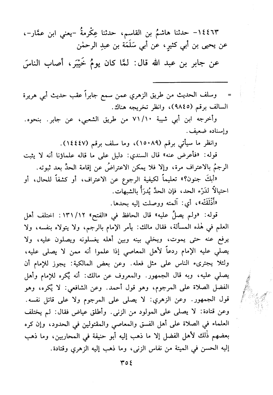 ١٤٤٦٣ - حَدَّثَنَا هَاشِمُ بْنُ الْقَاسِمِ، حَدَّثَنَا عِكْرِمَةُ يَعْنِي ابْنَ عَمَّارٍ، عَنْ يَحْيَى بْنِ أَبِي كَثِيرٍ، عَنْ أَبِي سَلَمَةَ بْنِ عَبْدِ الرَّحْمَنِ، عَنْ جَابِرِ بْنِ عَبْدِ اللهِ، قَالَ: لَمَّا كَانَ يَوْمُ خَيْبَرَ أَصَابَ النَّاسَ