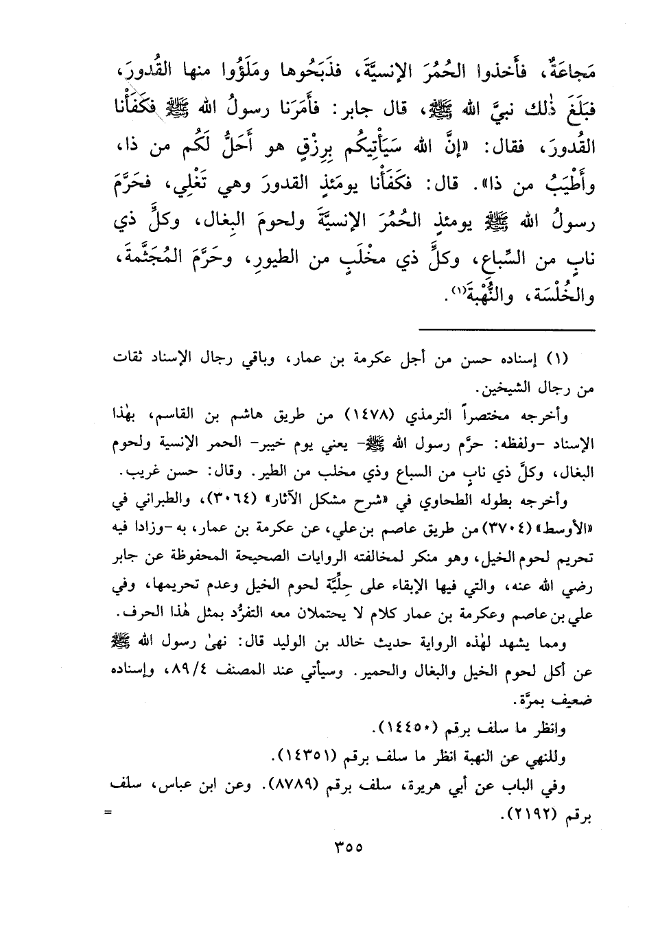 ومما يشهد لهذه الرواية حديث خالد بن الوليد قال: نهى رسول الله صَلَّى اللهُ عَلَيْهِ وَسَلَّمَ عن أكل لحوم الخيل والبغال والحمير. وسيأتي عند المصنف ٤/٨٩، وإسناده ضعيف بمرَّة.
