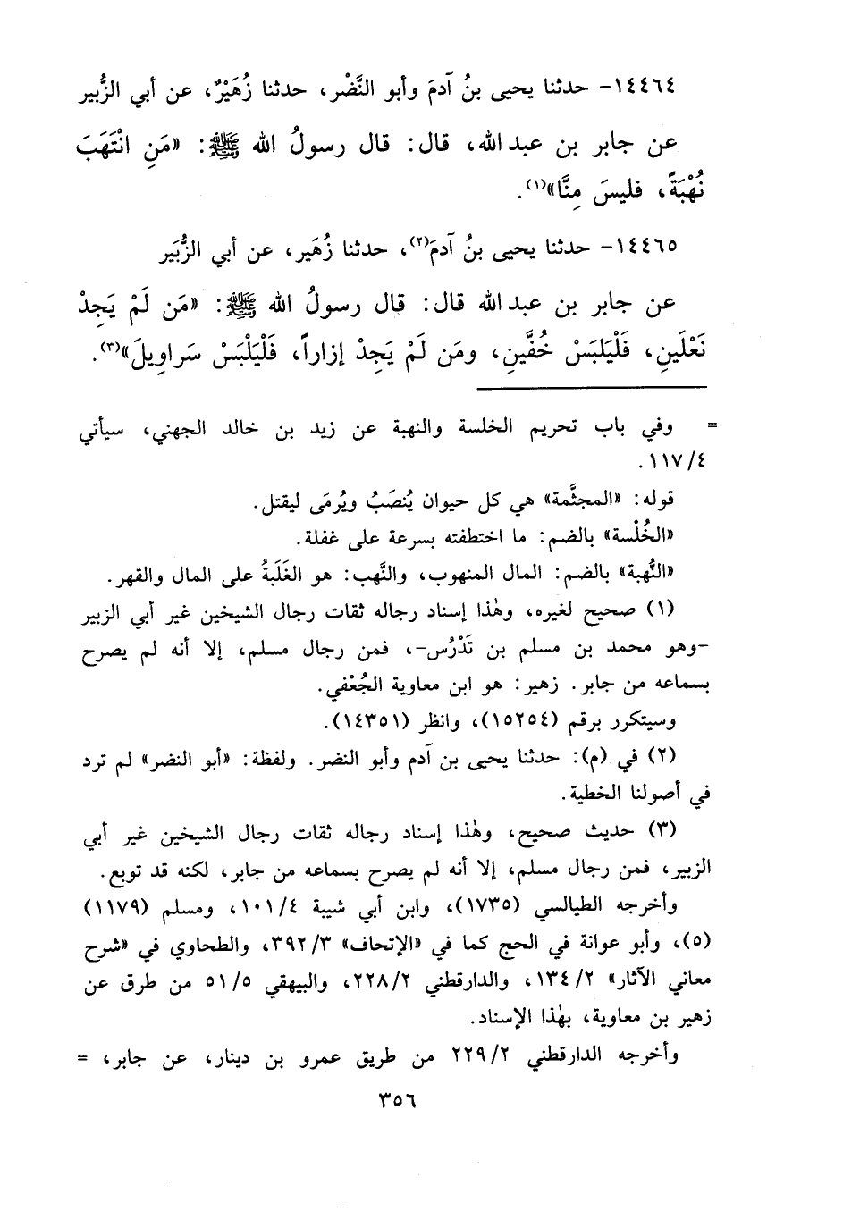 ١٤٤٦٤ - حَدَّثَنَا يَحْيَى بْنُ آدَمَ، وَأَبُو النَّضْرِ، حَدَّثَنَا زُهَيْرٌ، عَنْ أَبِي الزُّبَيْرِ، عَنْ جَابِرِ بْنِ عَبْدِ اللهِ، قَالَ: قَالَ رَسُولُ اللهِ صَلَّى اللهُ عَلَيْهِ وَسَلَّمَ: " مَنْ انْتَهَبَ نُهْبَةً فَلَيْسَ مِنَّا " (١)