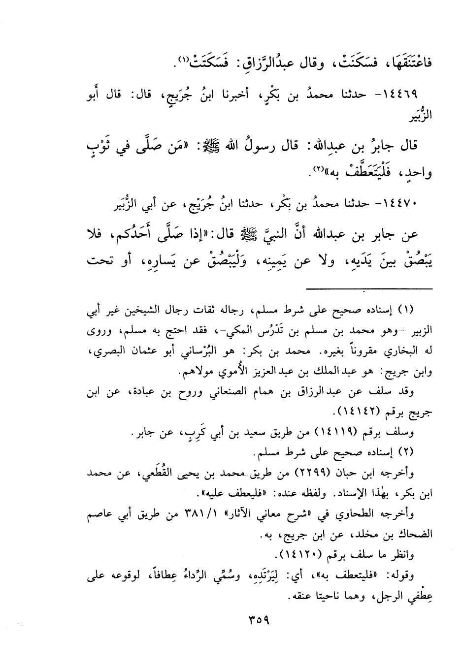١٤٤٦٩ - حَدَّثَنَا مُحَمَّدُ بْنُ بَكْرٍ، أَخْبَرَنَا ابْنُ جُرَيْجٍ، قَالَ: قَالَ أَبُو الزُّبَيْرِ، قَالَ جَابِرُ بْنُ عَبْدِ اللهِ: قَالَ رَسُولُ اللهِ صَلَّى اللهُ عَلَيْهِ وَسَلَّمَ: " مَنْ صَلَّى فِي ثَوْبٍ وَاحِدٍ، فَلْيَتَعَطَّفْ بِهِ " (٢)