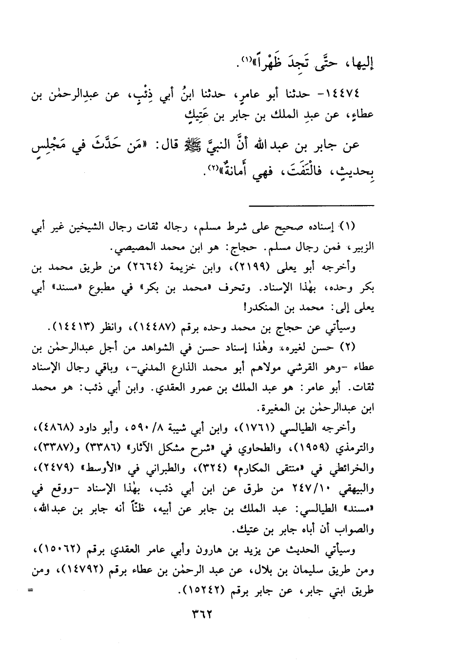 ١٤٤٧٤ - حَدَّثَنَا أَبُو عَامِرٍ، حَدَّثَنَا ابْنُ أَبِي ذِئْبٍ، عَنْ عَبْدِ الرَّحْمَنِ بْنِ عَطَاءٍ، عَنْ عَبْدِ الْمَلِكِ بْنِ جَابِرِ بْنِ عَتِيكٍ، عَنْ جَابِرِ بْنِ عَبْدِ اللهِ، أَنَّ النَّبِيَّ صَلَّى اللهُ عَلَيْهِ وَسَلَّمَ قَالَ: " مَنْ حَدَّثَ فِي مَجْلِسٍ بِحَدِيثٍ، فَالْتَفَتَ، فَهِيَ أَمَانَةٌ (٢) "