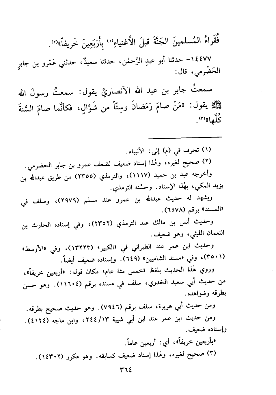 ١٤٤٧٧ - حَدَّثَنَا أَبُو عَبْدِ الرَّحْمَنِ، حَدَّثَنَا سَعِيدٌ، حَدَّثَنِي عَمْرُو بْنُ جَابِرٍ الْحَضْرَمِيُّ، قَالَ: سَمِعْتُ جَابِرَ بْنَ عَبْدِ اللهِ الْأَنْصَارِيَّ، يَقُولُ: سَمِعْتُ رَسُولَ اللهِ صَلَّى اللهُ عَلَيْهِ وَسَلَّمَ يَقُولُ: " مَنْ صَامَ رَمَضَانَ، وَسِتًّا مِنْ شَوَّالٍ، فَكَأَنَّمَا صَامَ السَّنَةَ كُلَّهَا " (٣)