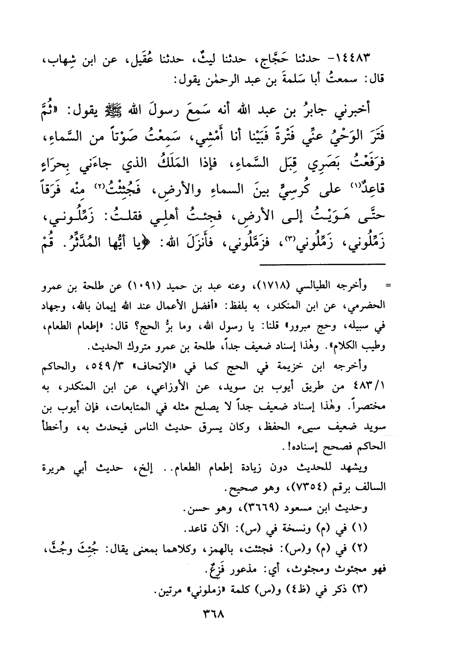١٤٤٨٣ - حَدَّثَنَا حَجَّاجٌ، حَدَّثَنَا لَيْثٌ، حَدَّثَنَا عُقَيْلٌ، عَنِ ابْنِ شِهَابٍ، قَالَ: سَمِعْتُ أَبَا سَلَمَةَ بْنَ عَبْدِ الرَّحْمَنِ، يَقُولُ: أَخْبَرَنِي جَابِرُ بْنُ عَبْدِ اللهِ، أَنَّهُ سَمِعَ رَسُولَ اللهِ صَلَّى اللهُ عَلَيْهِ وَسَلَّمَ يَقُولُ: " ثُمَّ فَتَرَ الْوَحْيُ عَنِّي فَتْرَةً، فَبَيْنَا أَنَا أَمْشِي سَمِعْتُ صَوْتًا مِنَ السَّمَاءِ، فَرَفَعْتُ بَصَرِي قِبَلَ السَّمَاءِ، فَإِذَا الْمَلَكُ الَّذِي جَاءَنِي بِحِرَاءٍ قَاعِدٌ (١) عَلَى كُرْسِيٍّ بَيْنَ السَّمَاءِ وَالْأَرْضِ، فَجُثِثْتُ (٢) مِنْهُ فَرَقًا حَتَّى هَوَيْتُ إِلَى الْأَرْضِ، فَجِئْتُ أَهْلِي، فَقُلْتُ: زَمِّلُونِي، زَمِّلُونِي، (٣) زَمِّلُونِي، فَزَمَّلُونِي، فَأَنْزَلَ اللهُ: {يَا أَيُّهَا الْمُدَّثِّرُ قُمْ