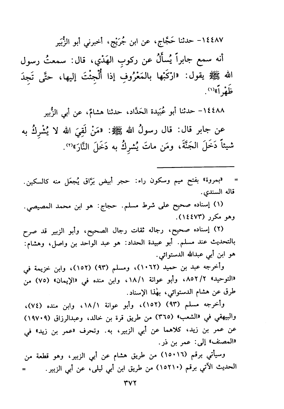 ١٤٤٨٨ - حَدَّثَنَا أَبُو عُبَيْدَةَ الْحَدَّادُ، حَدَّثَنَا هِشَامٌ، عَنْ أَبِي الزُّبَيْرِ، عَنْ جَابِرٍ، قَالَ: قَالَ رَسُولُ اللهِ صَلَّى اللهُ عَلَيْهِ وَسَلَّمَ: " مَنْ لَقِيَ اللهَ لَا يُشْرِكُ بِهِ شَيْئًا دَخَلَ الْجَنَّةَ، وَمَنْ مَاتَ يُشْرِكُ بِهِ دَخَلَ النَّارَ " (٢)