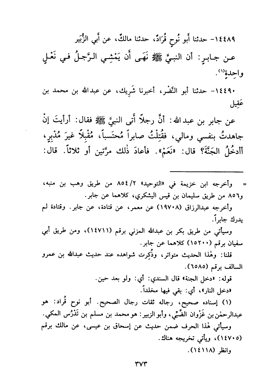 ١٤٤٨٩ - حَدَّثَنَا أَبُو نُوحٍ قُرَادٌ، حَدَّثَنَا مَالِكٌ، عَنْ أَبِي الزُّبَيْرِ، عَنْ جَابِرٍ، " أَنَّ النَّبِيَّ صَلَّى اللهُ عَلَيْهِ وَسَلَّمَ، نَهَى أَنْ يَمْشِيَ الرَّجُلُ فِي نَعْلٍ وَاحِدَةٍ " (١)