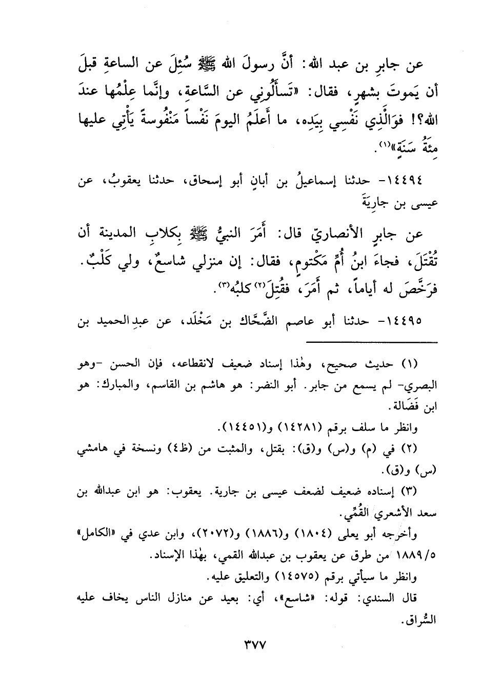 ١٤٤٩٤ - حَدَّثَنَا إِسْمَاعِيلُ بْنُ أَبَانَ أَبُو إِسْحَاقَ، حَدَّثَنَا يَعْقُوبُ، عَنْ عِيسَى بْنِ جَارِيَةَ، عَنْ جَابِرٍ الْأَنْصَارِيِّ، قَالَ: " أَمَرَ النَّبِيُّ صَلَّى اللهُ عَلَيْهِ وَسَلَّمَ بِكِلَابِ الْمَدِينَةِ أَنْ تُقْتَلَ، فَجَاءَ ابْنُ أُمِّ مَكْتُومٍ، فَقَالَ: إِنَّ مَنْزِلِي شَاسِعٌ، وَلِي كَلْبٌ، فَرَخَّصَ لَهُ أَيَّامًا، ثُمَّ أَمَرَ فَقُتِلَ (٢) كَلْبِهِ " (٣)