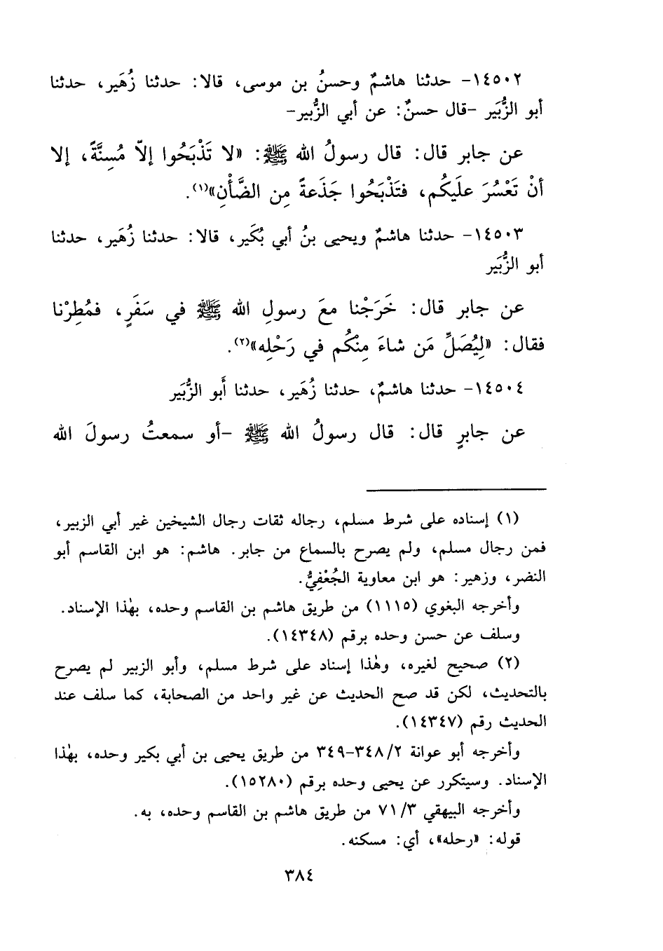(١) إسناده على شرط مسلم، رجاله ثقات رجال الشيخين غير أبي الزبير، فمن رجال مسلم، ولم يصرح بالسماع من جابر. هاشم: هو ابن القاسم أبو النضر، وزهير: هو ابن معاوية الجُعْفِيّ.