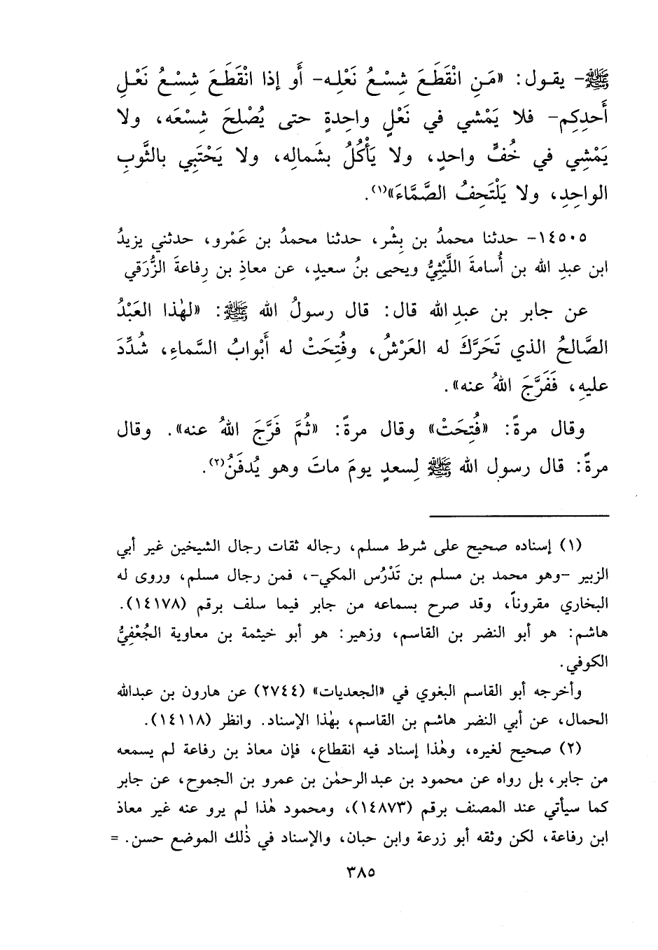 ١٤٥٠٥ - حَدَّثَنَا مُحَمَّدُ بْنُ بِشْرٍ، حَدَّثَنَا مُحَمَّدُ بْنُ عَمْرٍو، حَدَّثَنِي يَزِيدُ بْنُ عَبْدِ اللهِ بْنِ أُسَامَةَ اللَّيْثِيُّ، وَيَحْيَى بْنُ سَعِيدٍ، عَنْ مُعَاذِ بْنِ رِفَاعَةَ الزُّرَقِيِّ، عَنْ جَابِرِ بْنِ عَبْدِ اللهِ، قَالَ: قَالَ رَسُولُ اللهِ صَلَّى اللهُ عَلَيْهِ وَسَلَّمَ: " لَهَذَا الْعَبْدُ الصَّالِحُ الَّذِي تَحَرَّكَ لَهُ الْعَرْشُ، وَفُتِحَتْ لَهُ أَبْوَابُ السَّمَاءِ، شُدِّدَ عَلَيْهِ، فَفَرَّجَ اللهُ عَنْهُ "، وَقَالَ مَرَّةً: " فُتِّحَتْ "، وَقَالَ مَرَّةً: " ثُمَّ فَرَّجَ اللهُ عَنْهُ "، وَقَالَ مَرَّةً: قَالَ رَسُولُ اللهِ صَلَّى اللهُ عَلَيْهِ وَسَلَّمَ لِسَعْدٍ يَوْمَ مَاتَ وَهُوَ يُدْفَنُ (٢)