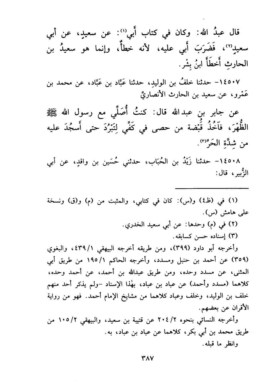 قَالَ عَبْدُ اللهِ: " وَكَانَ فِي كِتَابِ أَبِي، (١) عَنْ سَعِيدٍ، عَنْ أَبِي سَعِيدٍ، (٢) فَضَرَبَ أَبِي عَلَيْهِ لِأَنَّهُ خَطَأٌ، وَإِنَّمَا هُوَ سَعِيدُ بْنُ الْحَارِثِ أَخْطَأَ ابْنُ بِشْرٍ "