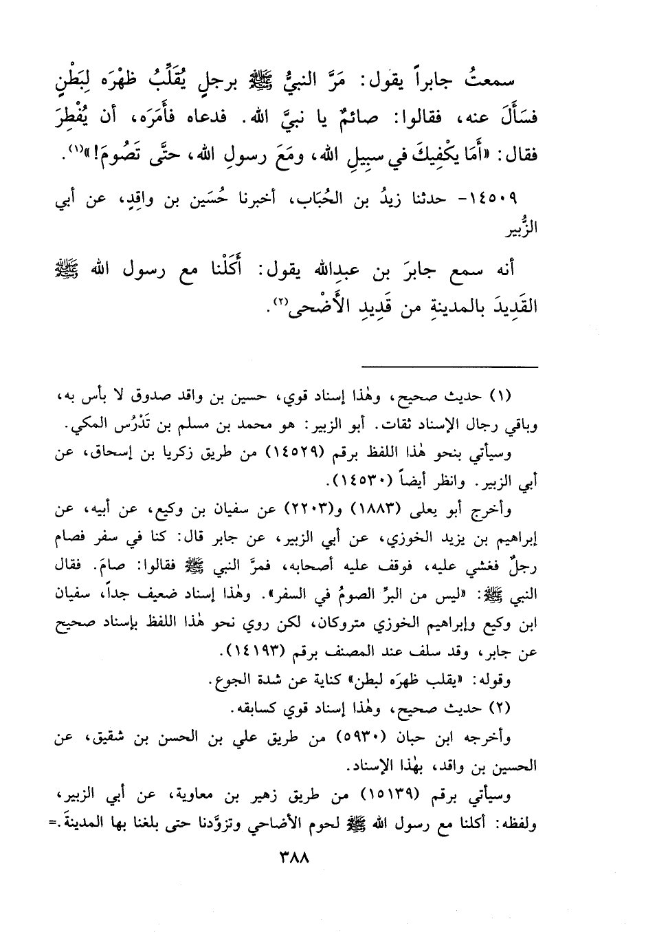 ١٤٥٠٩ - حَدَّثَنَا زَيْدُ بْنُ الْحُبَابِ، أَخْبَرَنَا حُسَيْنُ بْنُ وَاقِدٍ، عَنْ أَبِي الزُّبَيْرِ، أَنَّهُ سَمِعَ جَابِرَ بْنَ عَبْدِ اللهِ، يَقُولُ: " أَكَلْنَا مَعَ رَسُولِ اللهِ صَلَّى اللهُ عَلَيْهِ وَسَلَّمَ الْقَدِيدَ بِالْمَدِينَةِ مِنْ قَدِيدِ الْأَضْحَى " (٢)