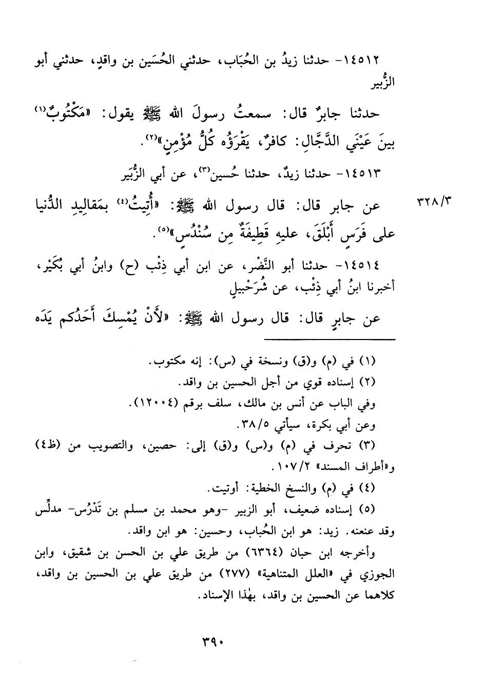 ١٤٥١٣ - حَدَّثَنَا زَيْدٌ، حَدَّثَنَا حُسَيْنٌ، (٣) عَنْ أَبِي الزُّبَيْرِ، عَنْ جَابِرٍ، قَالَ: قَالَ رَسُولُ اللهِ صَلَّى اللهُ عَلَيْهِ وَسَلَّمَ: " أُتِيتُ (٤) بِمَقَالَيدِ الدُّنْيَا عَلَى فَرَسٍ أَبْلَقَ، عَلَيْهِ قَطِيفَةٌ مِنْ سُنْدُسٍ " (٥)