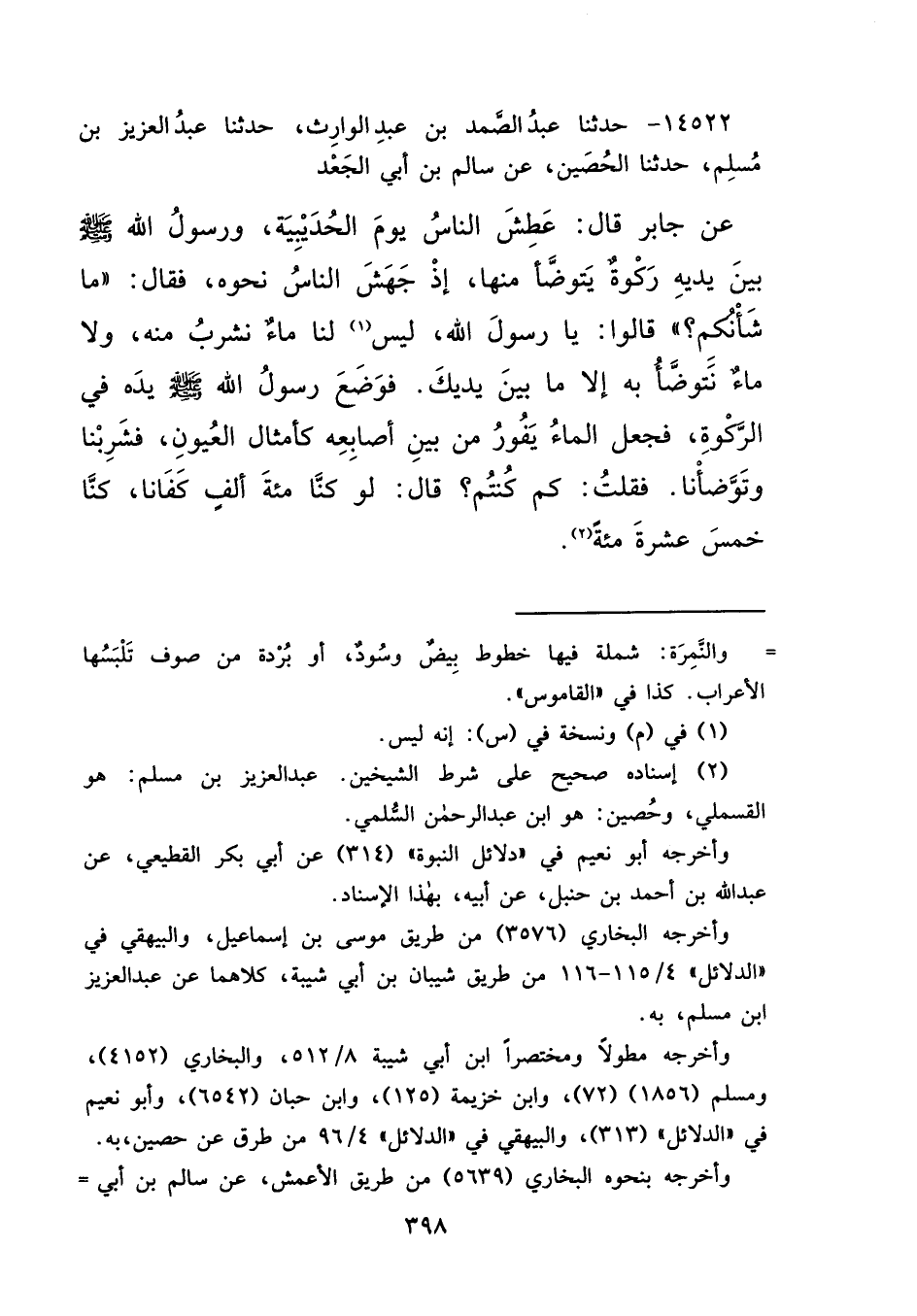 ١٤٥٢٢ - حَدَّثَنَا عَبْدُ الصَّمَدِ بْنُ عَبْدِ الْوَارِثِ، حَدَّثَنَا عَبْدُ الْعَزِيزِ بْنُ مُسْلِمٍ، حَدَّثَنَا الْحُصَيْنُ، عَنْ سَالِمِ بْنِ أَبِي الْجَعْدِ، عَنْ جَابِرٍ، قَالَ: عَطِشَ النَّاسُ يَوْمَ الْحُدَيْبِيَةِ، وَرَسُولُ اللهِ صَلَّى اللهُ عَلَيْهِ وَسَلَّمَ بَيْنَ يَدَيْهِ رَكْوَةٌ يَتَوَضَّأُ مِنْهَا، إِذْ جَهَشَ النَّاسُ نَحْوَهُ، فَقَالَ: " مَا شَأْنُكُمْ؟ " قَالَوا: يَا رَسُولَ اللهِ إِنَّهُ لَيْسَ (١) لَنَا مَاءٌ نَشْرَبُ مِنْهُ، وَلَا مَاءٌ نَتَوَضَّأُ بِهِ إِلَّا مَا بَيْنَ يَدَيْكَ، فَوَضَعَ رَسُولُ اللهِ صَلَّى اللهُ عَلَيْهِ وَسَلَّمَ يَدَهُ فِي الرَّكْوَةِ، فَجَعَلَ الْمَاءُ يَفُورُ مِنْ بَيْنِ أَصَابِعِهِ كَأَمْثَالِ الْعُيُونِ، فَشَرِبْنَا وَتَوَضَّأْنَا، فَقُلْتُ: كَمْ كُنْتُمْ؟ قَالَ: لَوْ كُنَّا مِائَةَ أَلْفٍ كَفَانَا كُنَّا خَمْسَ عَشْرَةَ مِائَةً (٢)